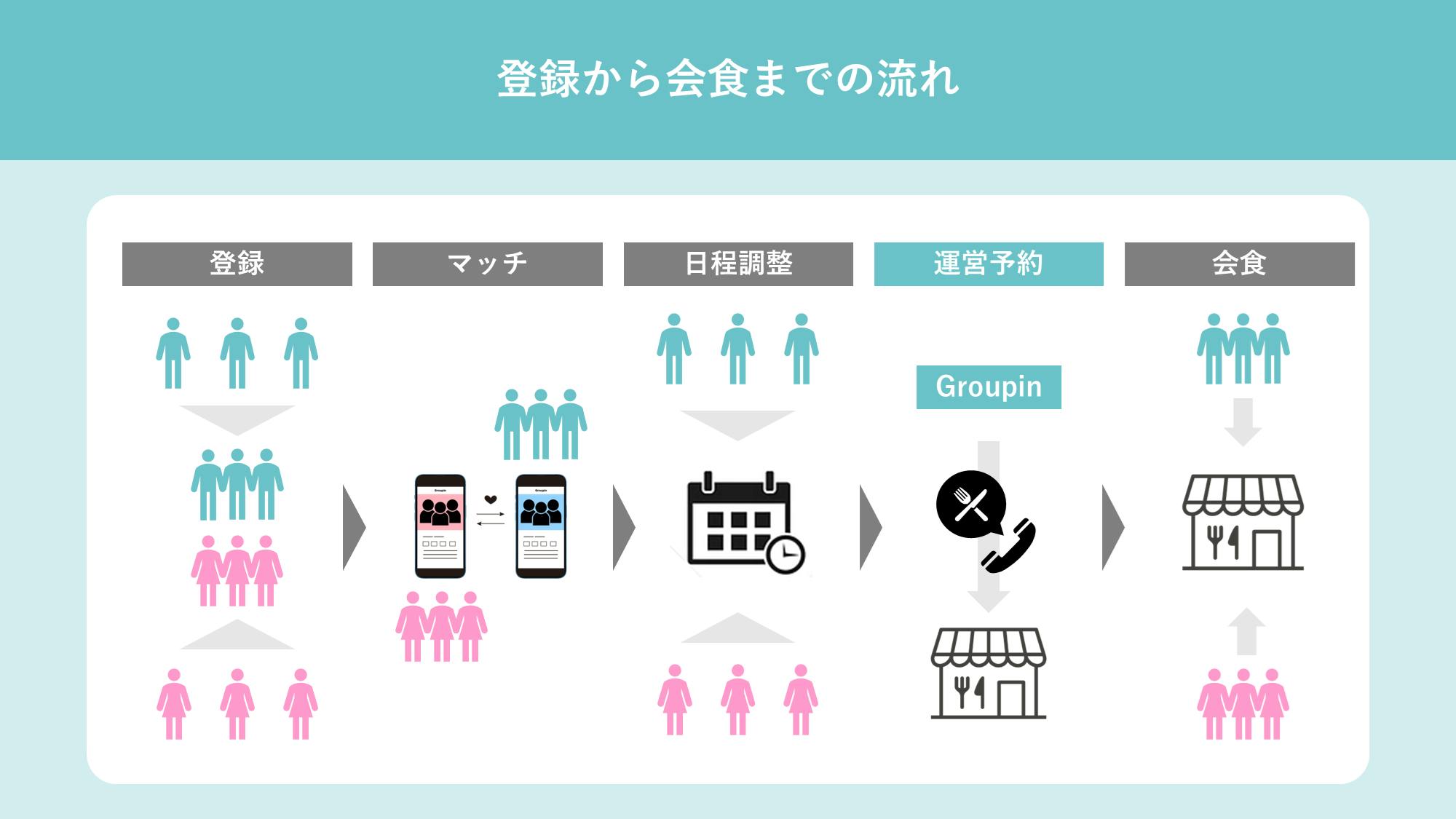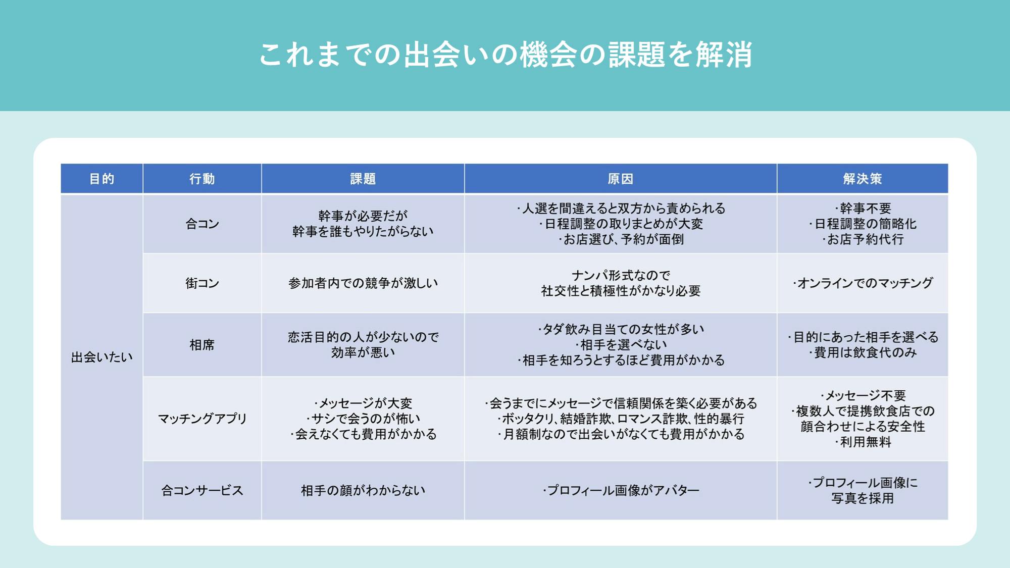 解決策 : 安心安全に出会ってもらうために、初めて会う場所を、公の場である提携飲食店に限定し、