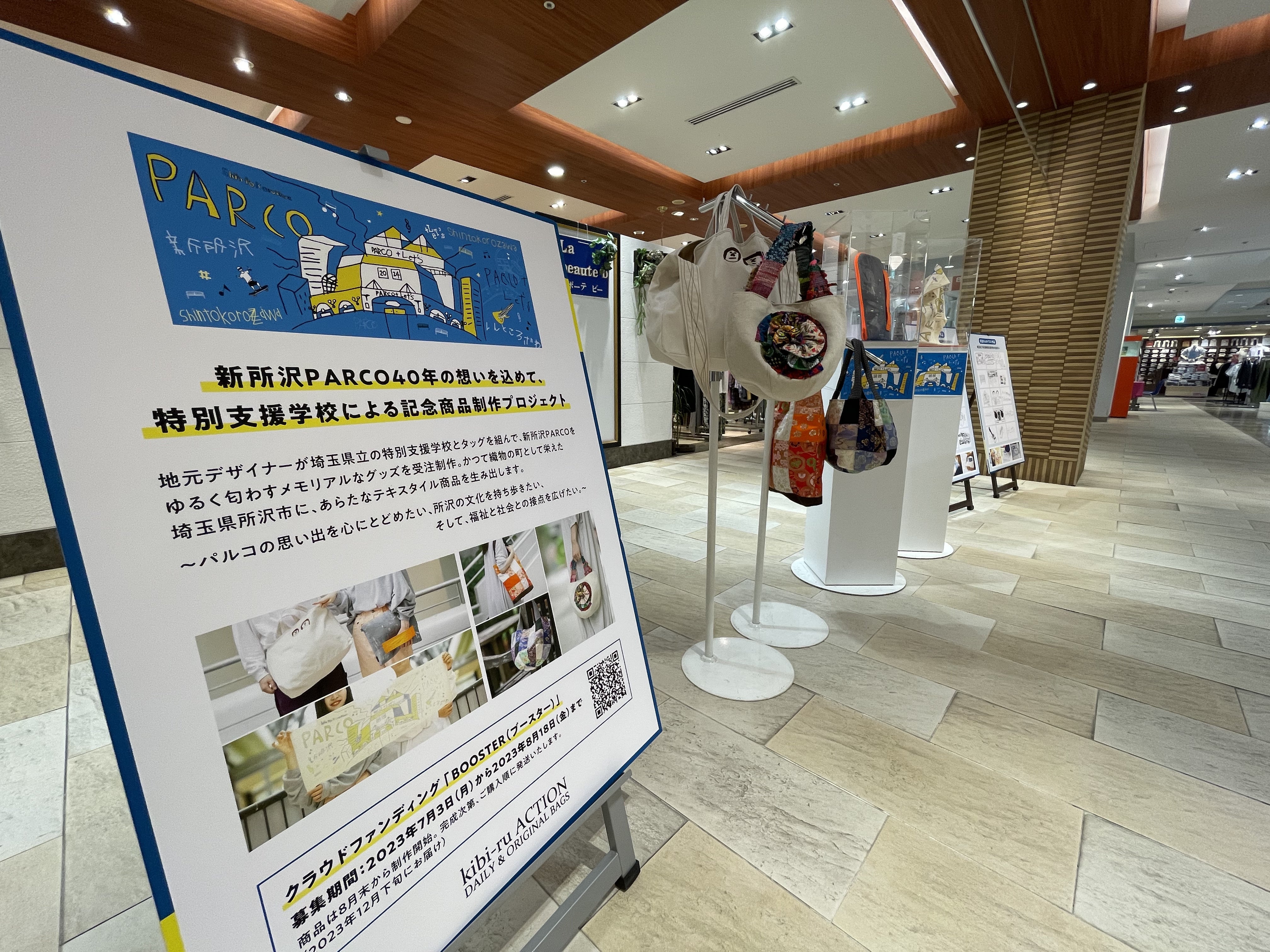 「埼玉県立和光南特別支援学校」と「埼玉県立入間わかくさ高等特別支援学校」の生徒たちが描いた、しんとこパルコのイラストと、本プロジェクトのリターン商品を展示。ぜひ、手にとってご覧ください。