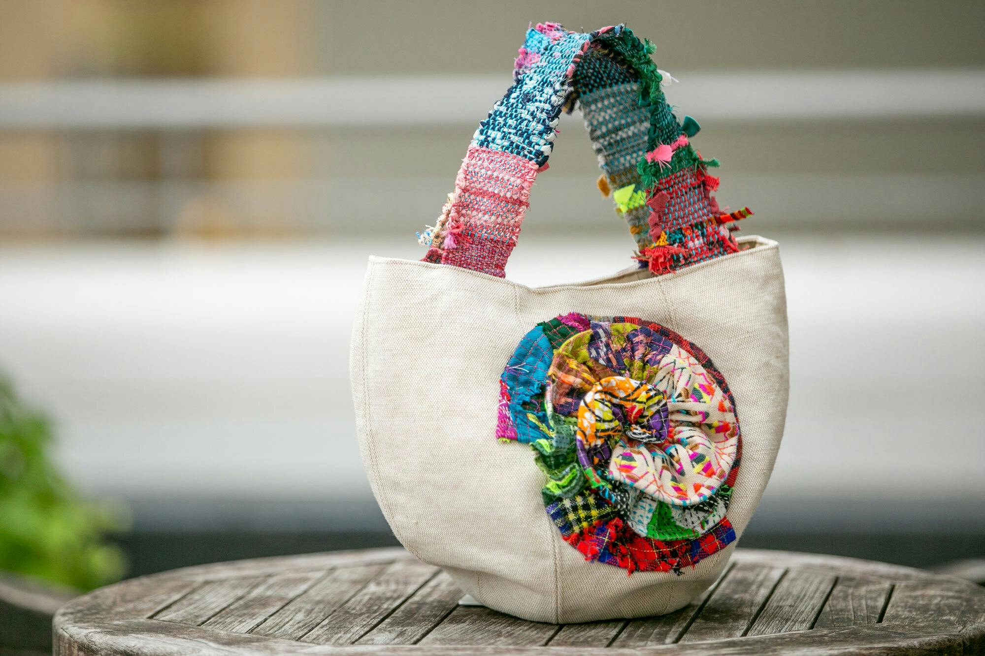 リターン商品の中で、最初にSOLD OUTとなったバッグ。工場から出る廃棄生地や民族布のはぎれでつくっています。所沢市の生活介護施設が裂き織にしたカラフルな持ち手、西東京市の障がい者支援施設でつくった花の形のモチーフ、繊細な手作業をいかした商品です。