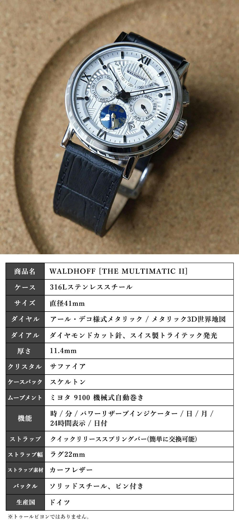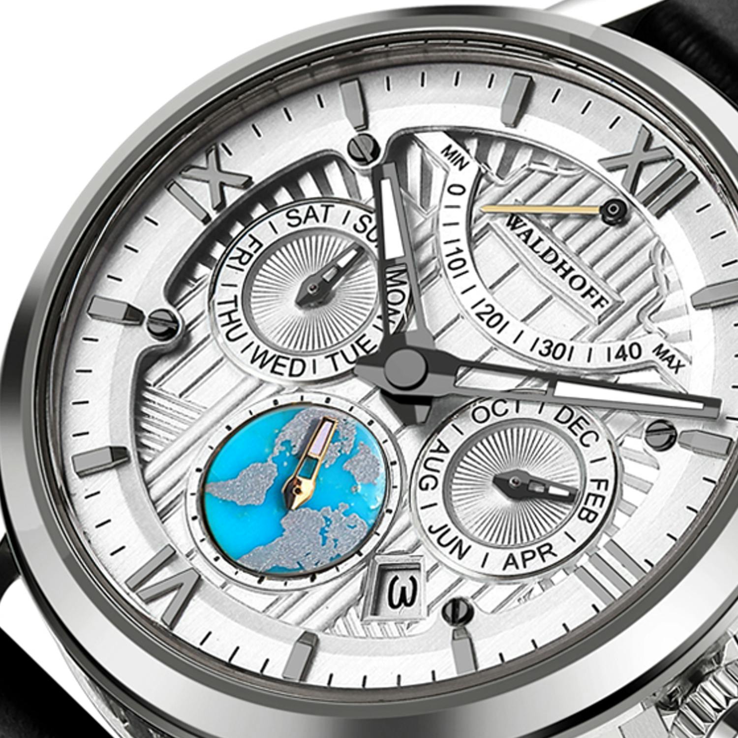 WALDHOFF [THE MULTIMATIC II]は1日の時間が分かる時計以外に、曜日、日、月を表示する3つのカレンダー機能を搭載。
