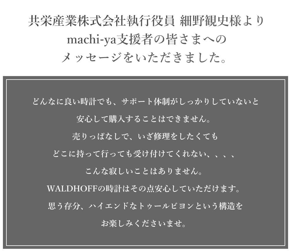今回もmachi-yaの支援者の皆様に安心してWALDHOFFの高級機械式時計をご使用いただくため、日本国内に設けた修理センターをご利用いただけます。