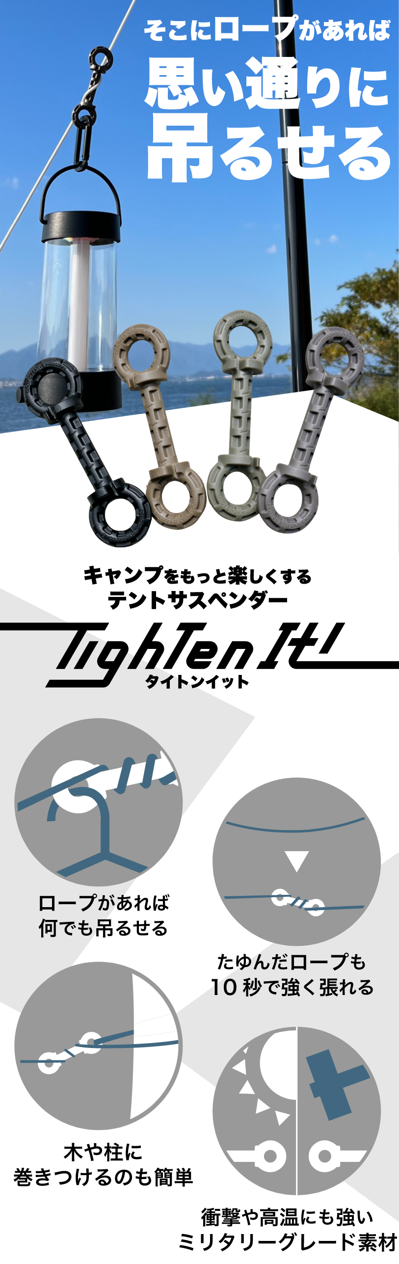 アクセサリーとしてもテントサスペンダーとしても使えるこの『Tighten It!』が、日本の皆さんのアウトドアをより豊かなものにしてくれる。私たちはそう信じています。