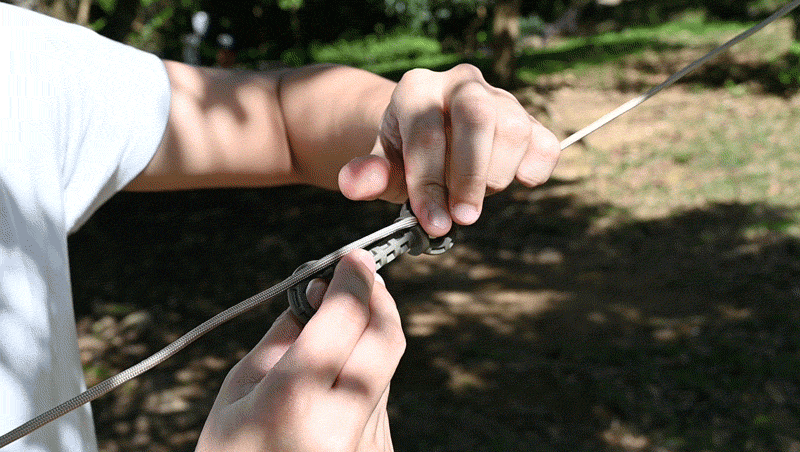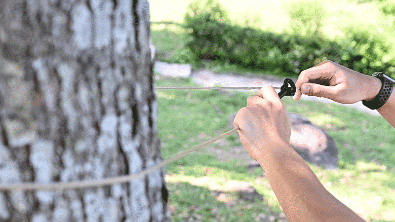木や柱があれば瞬時にロープを結べるのも『Tighten It!』の魅力のひとつ。独自構造でしっかりとロープを止めることが出来るので、難しい結び方を覚える必要もありません。