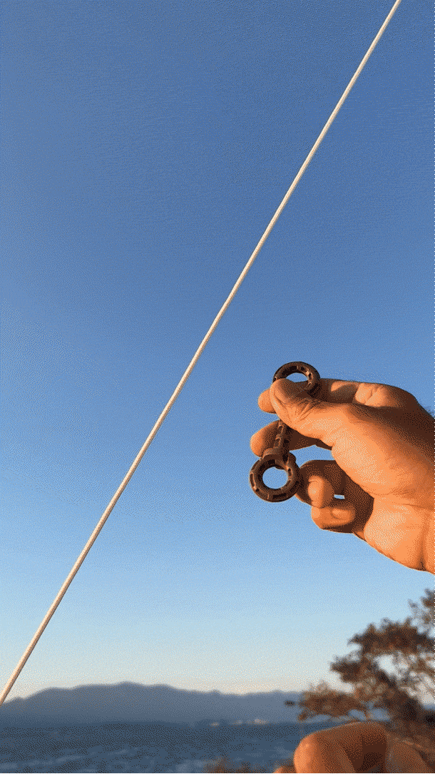 ロープを縛るのはとても簡単。『Tighten It!』の中央にロープを巻いて、リングの手前のくぼみに掛けるだけ。