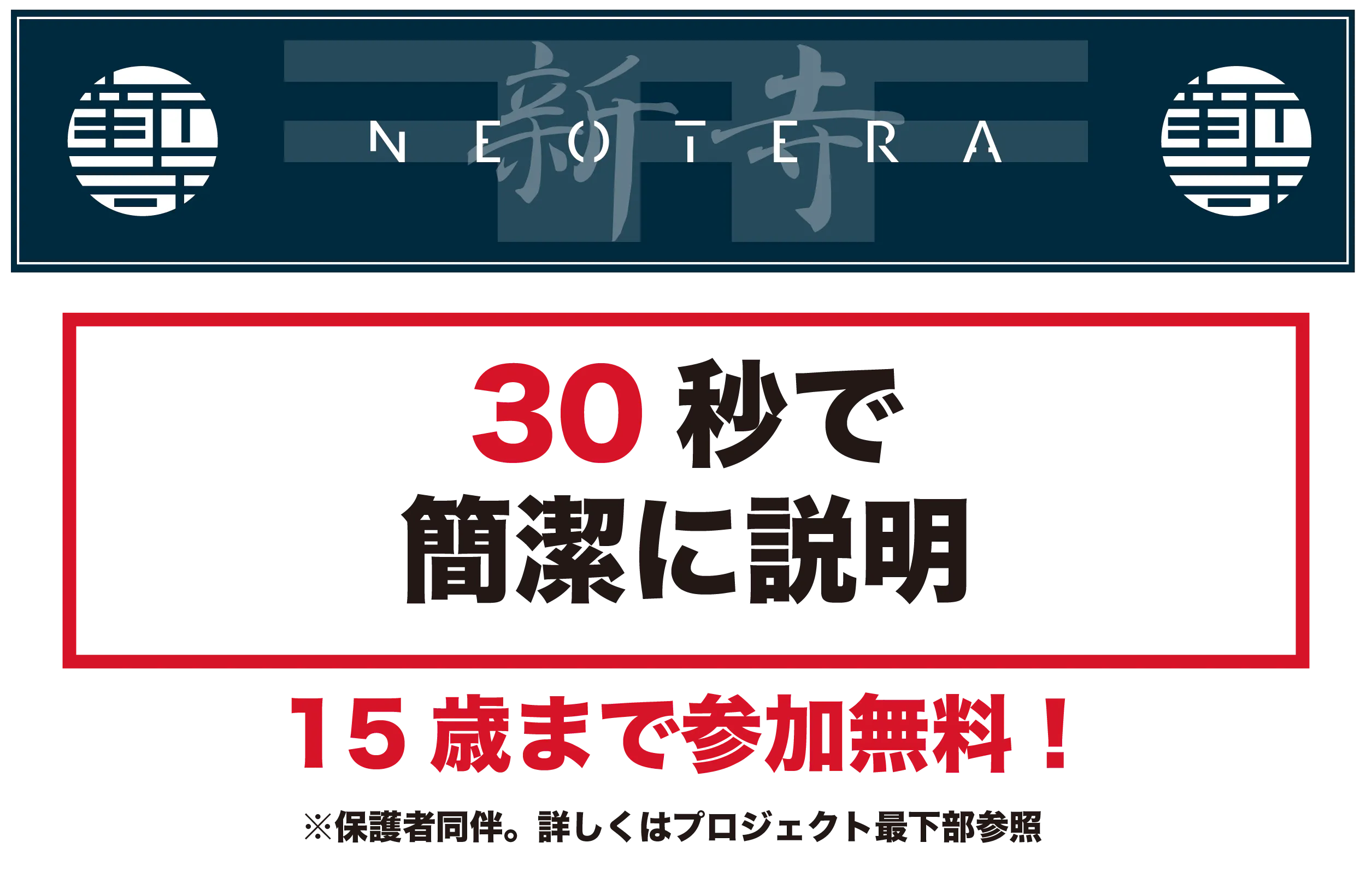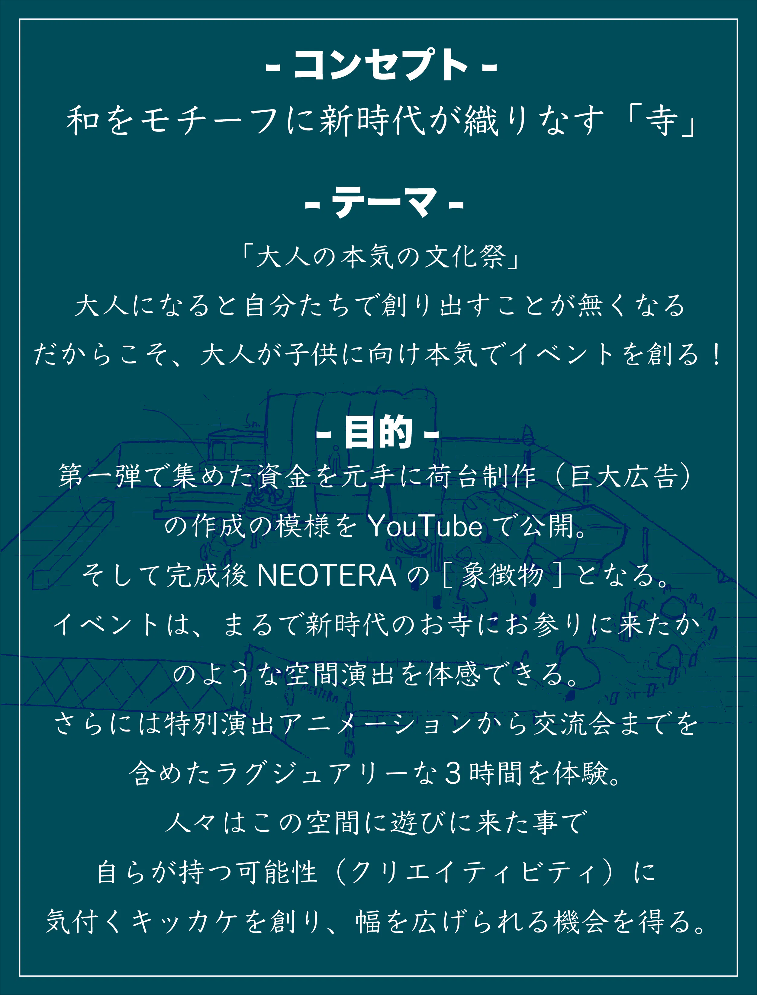 子供たちの未来に意識を向け、大人が本気で創作、制作したモノを体験し、子供たちの創造力、すなわちクリエイティビティ向上を図る、日本の明るい未来を創るイベント『NEOTERA ~新寺~』を開催したいです!