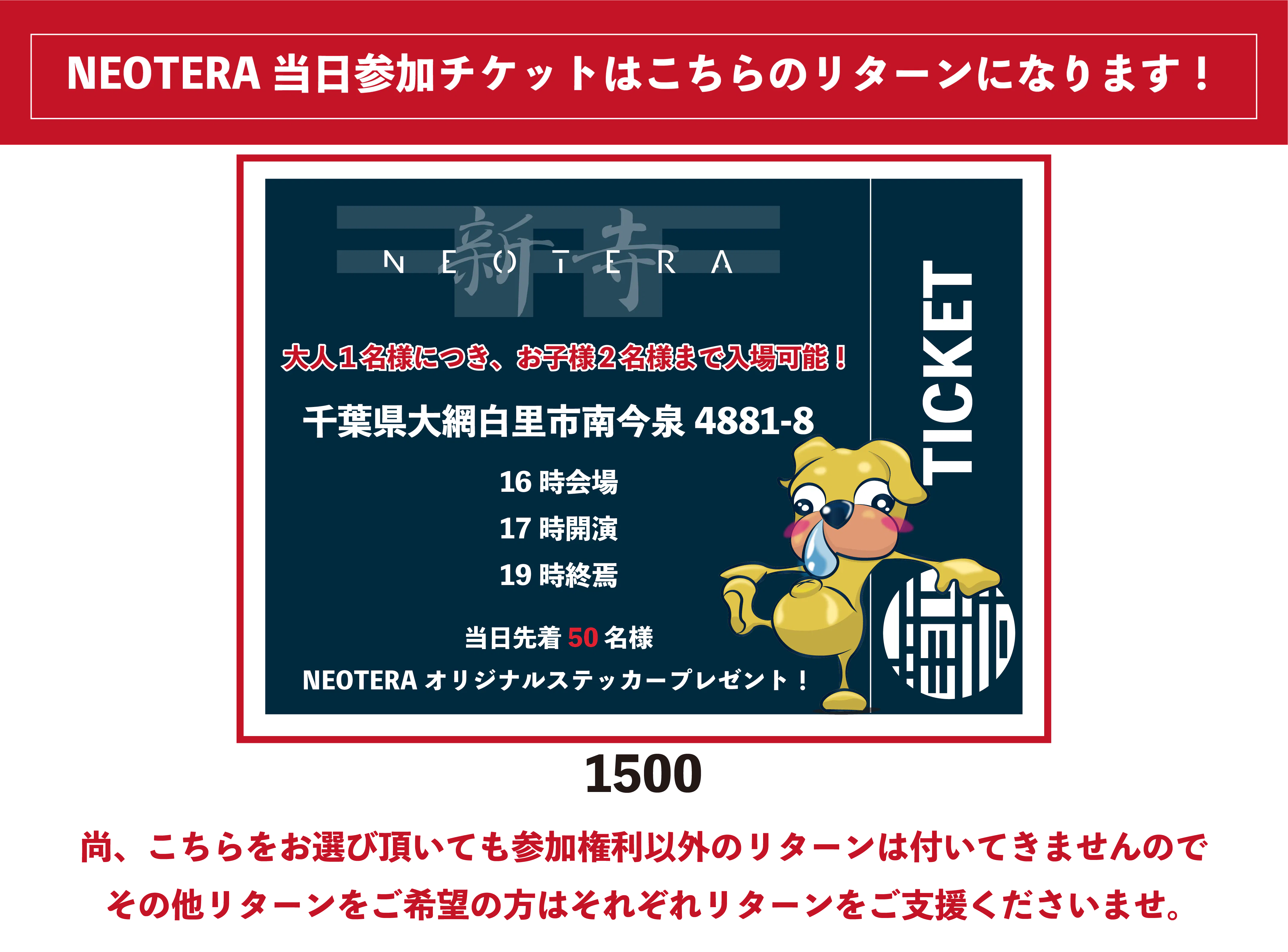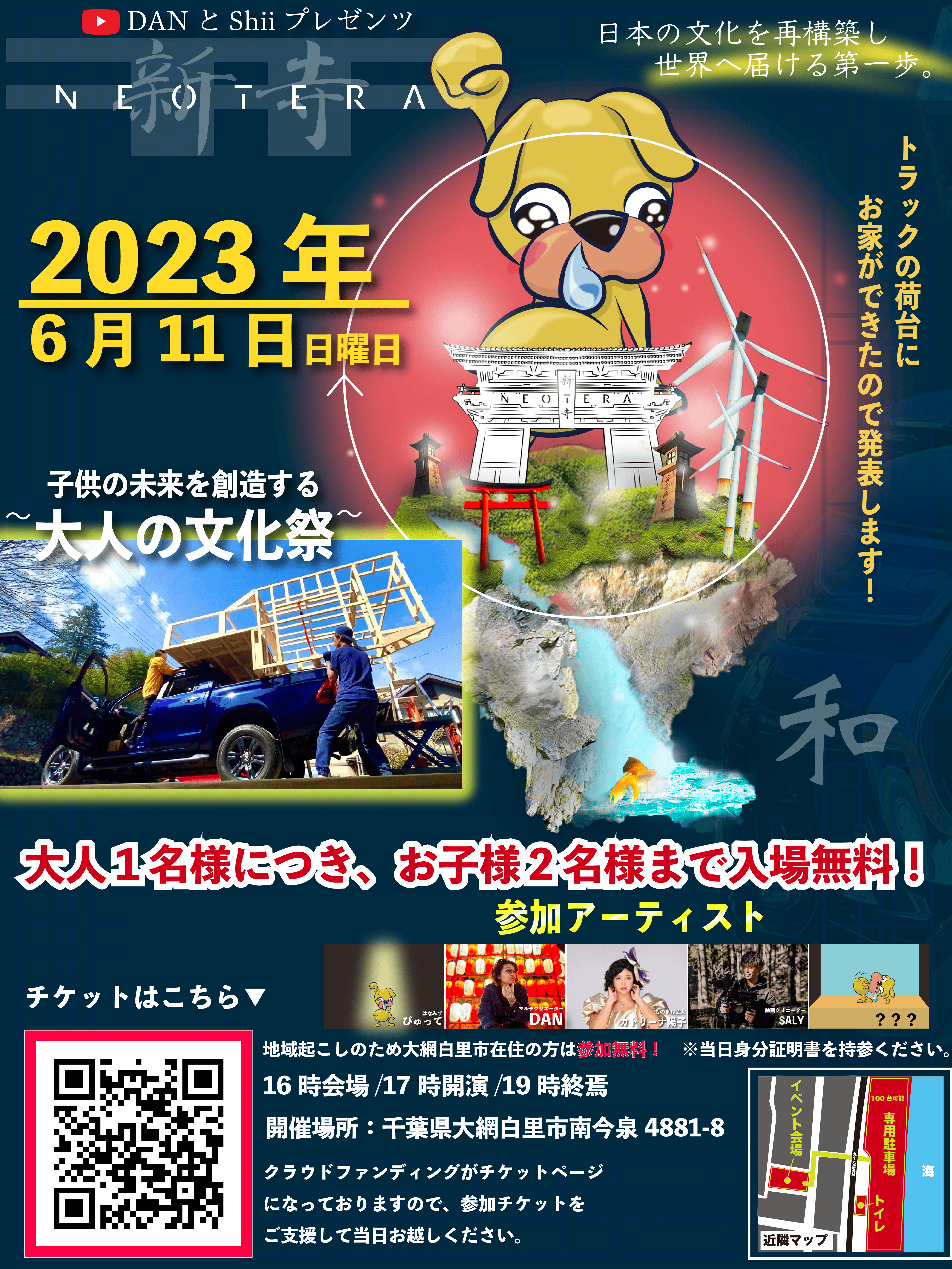 2023/05/22 18:00クラウドファンディングの大成功ありがとうございました!皆様には本当に心より感謝申し上げます。こうしてイベント開催までたどり着く事ができました!現在コンテンツも充実し、イベント開催が盛り上がる予感でいっぱいでございます!出店店舗様も10店舗以上出店いただきます!とても充実した『大人の文化祭』になる事間違えなしです!【テーマ】子供の未来へ捧ぐ大人の文化祭【コンテンツ】・飲食・物販・ライブ・ワークショップ・参加型ゲーム・展示と言った学生時代やっていたアレを大人がやるとこうなるよ!っていう子供へのメッセージです!すでに大人が大人の規模感で楽しんでいると子供はそれが良い物なんだ!と一つの教育になります。ボクは公務員さんのような教養、教育はできませんが「生きていく術」を授けることは沢山できます!そしてそういったクリエイティブな大人が沢山その願いのサポートをしてくれます!だからこそ今大人が立ち上がるべきだとこのイベントのゴールまでたどり着くための準備をしました!そして後はこのイベントに、より多くの方にお越し頂き一緒に盛り上げて頂くのみとなっております!このDMをお読みの方は是非千葉県大網白里市で待ってます♪【NEOTERA】【開催場所住所】千葉県大網白里市南今泉4881-8【駐車場】白里海水浴場パーキングをご利用ください。こちらは市に許可を得て当日専用の駐車場となりますので近隣でその他の駐車や迷惑になる行為はご遠慮下さいませ。●料金普通車500中型車700大型車1000二輪車100▼イベント参加に関しての注意▼・シリアルナンバーと名前で管理しますのでご参加当日に購入後のメール画面を提示下さい。・原則大人1名様につき、お子様2名様までとさせていただきます。・お買い求めの際にお子様(15歳以下)の人数を備考欄にてご明記ください。・お子様(15歳以下)のみでのご来場はできません。保護者様同伴でお願いいたします。・イベントをスムーズに行うよう、来場者様はスタッフの指示に従いイベント参加お願いします。・尚、指示に従って頂けない方、危険を感じる言動をされる方は入場をお断りする場合や退場していただく場合があります。最悪の場合イベントを中止させて頂く場合がございます。その際に発生した損害を請求する場合がございます。・緊急時はスタッフの指示に従ってください。・イベントスケジュールはタイムスケジュールをご覧ください。・お怪我やお客様同士のトラブルは一切の責任を負いません。・会場内・外で発生した事故・盗難等は、主催者・会場・出演者は一切責任を負いません。・お荷物や貴重品は各自ご自身で管理してください。・イベント中に迷惑行為やトラブルの原因になり兼ねる事をしている方には退場していただく場合がございます。・危険物や薬物の持ち込みは禁止です。発見し次第退場していただきます。・イベントが中止、延期になったとしても、宿泊費、交通費等の補償はいたしません。・自然災害、参加アーティストの体調不良等でイベント内容の一部変更、もしくは中止をさせて頂く場合がございます。・イベントの模様は動画、写真撮影を行います、その際にお客様が映り込む場合がございますので予めご了承ください。・このイベントは沢山の方のお力により作られておりますので一人一人の丁寧な心がけよろしくお願いいたします。・駐車場内でのエンジン吹かし、騒音、音楽などは禁止です。発見し次第注意、最悪の場合ご退場をお願いする場合がございます。・駐車場スペースを余分に使うテント貼りは禁止です。・金銭のやりとりは禁止です。・物販、飲食は禁止です。上記ルールを守り楽しく過ごしましょう。 もっと見る