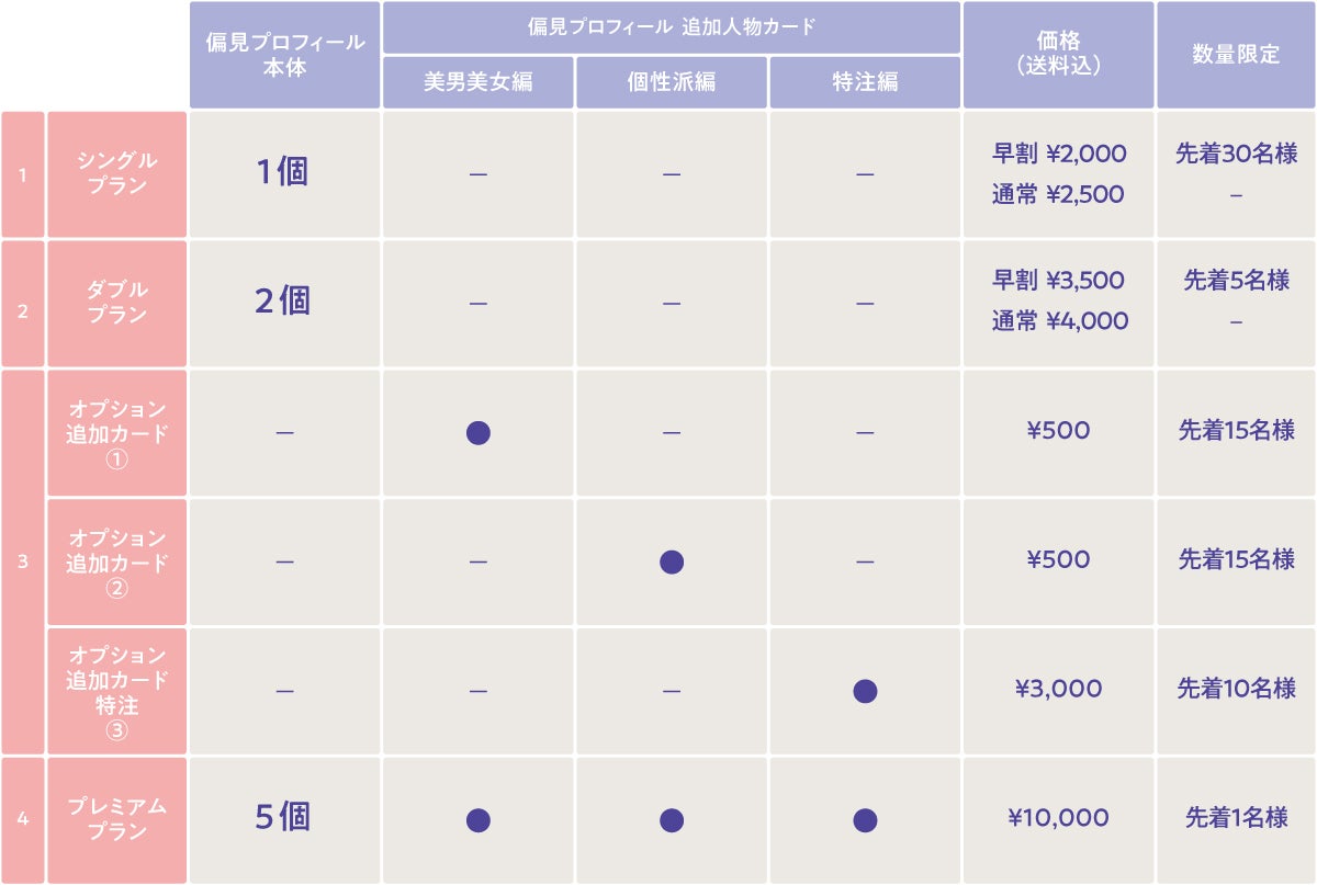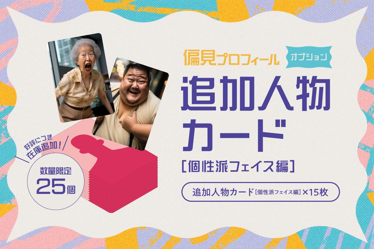 ☑ 『偏見プロフィール』シングルプラン・ダブルプランにお申込み頂いた方限定で、追加人物カード[個性派編]15枚をお送りするプランです。