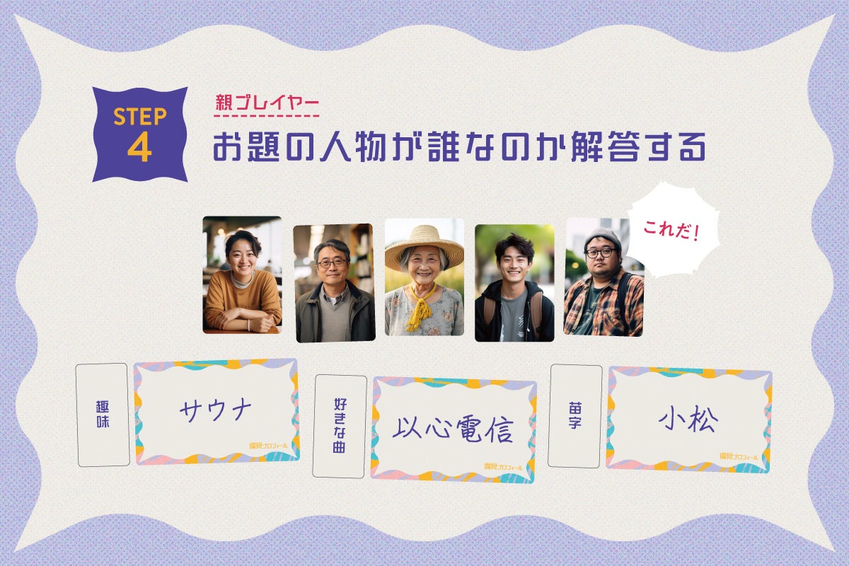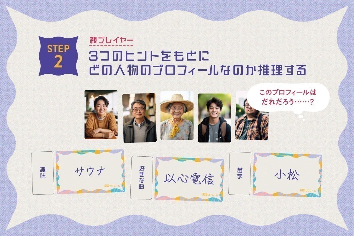 さあ、いよいよお題の人物を当てるための偏見プロフィールの発表です。自信がない子プレイヤーから順番に、ヒントをオープンしていきます。1つオープンするごとに推理トークを楽しみましょう!