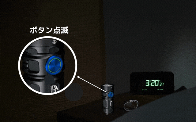 ・ボタン0.5秒長押しでエコモードへ※エコモードは最長800時間(約33日間)連続点灯します。