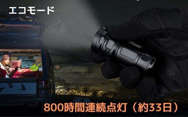 ※充電満タン時でエコモードで約800時間(約33日間)連続点灯します。