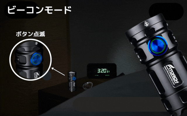 ・電源OFF時にボタンを3回連続でクリックすると電源検出機能が作動、ボタン周りのランプが点滅して電圧を表示。緑色のランプが1.0Vを示し、赤色のランプが0.1Vを示します。※例えばバッテリー残量が3.8Vの場合は緑ランプが3回、赤ランプが8回点滅します。