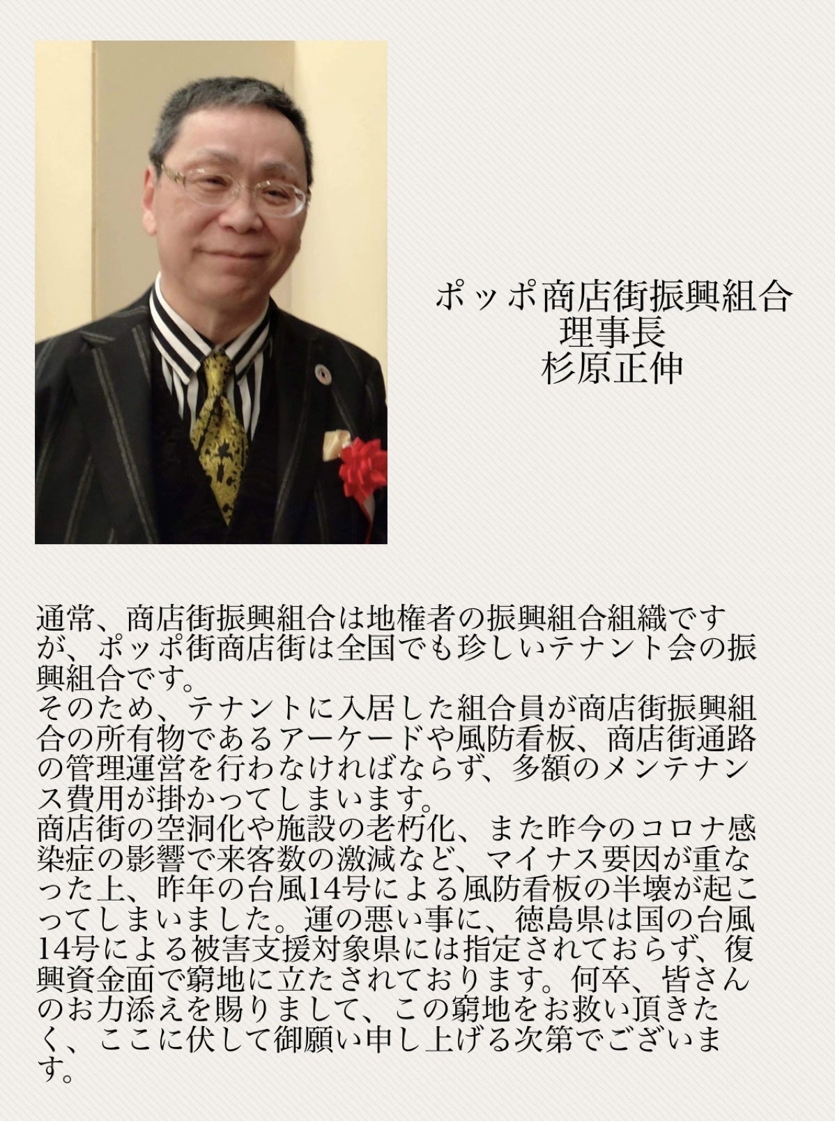 ●本プロジェクトへのご支援は控除の対象にはなりませんが、当商店街振興組合への賛助金として、領収書は発行できます。予めご留意ください。