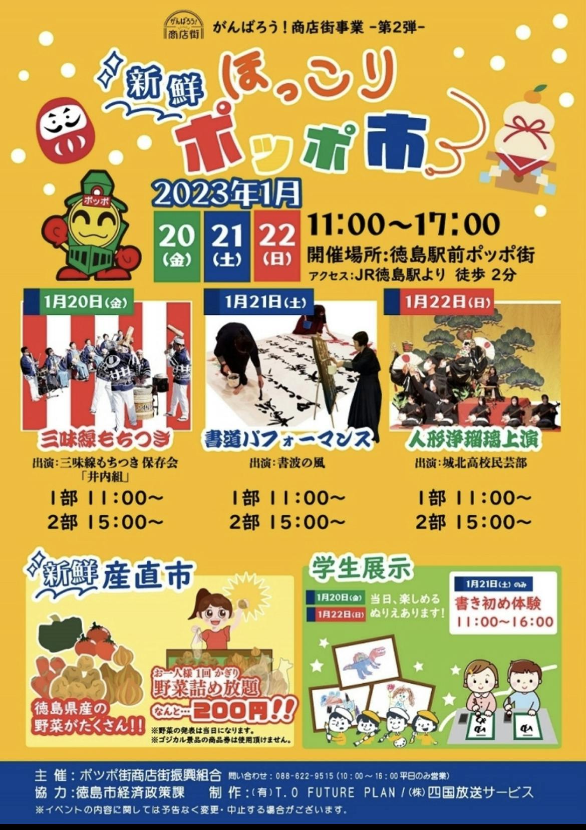 ポッポ街商店街は徳島駅に隣接した商店街で、全長160メートル×幅4メートルの歩行者だけが通れる商店街。