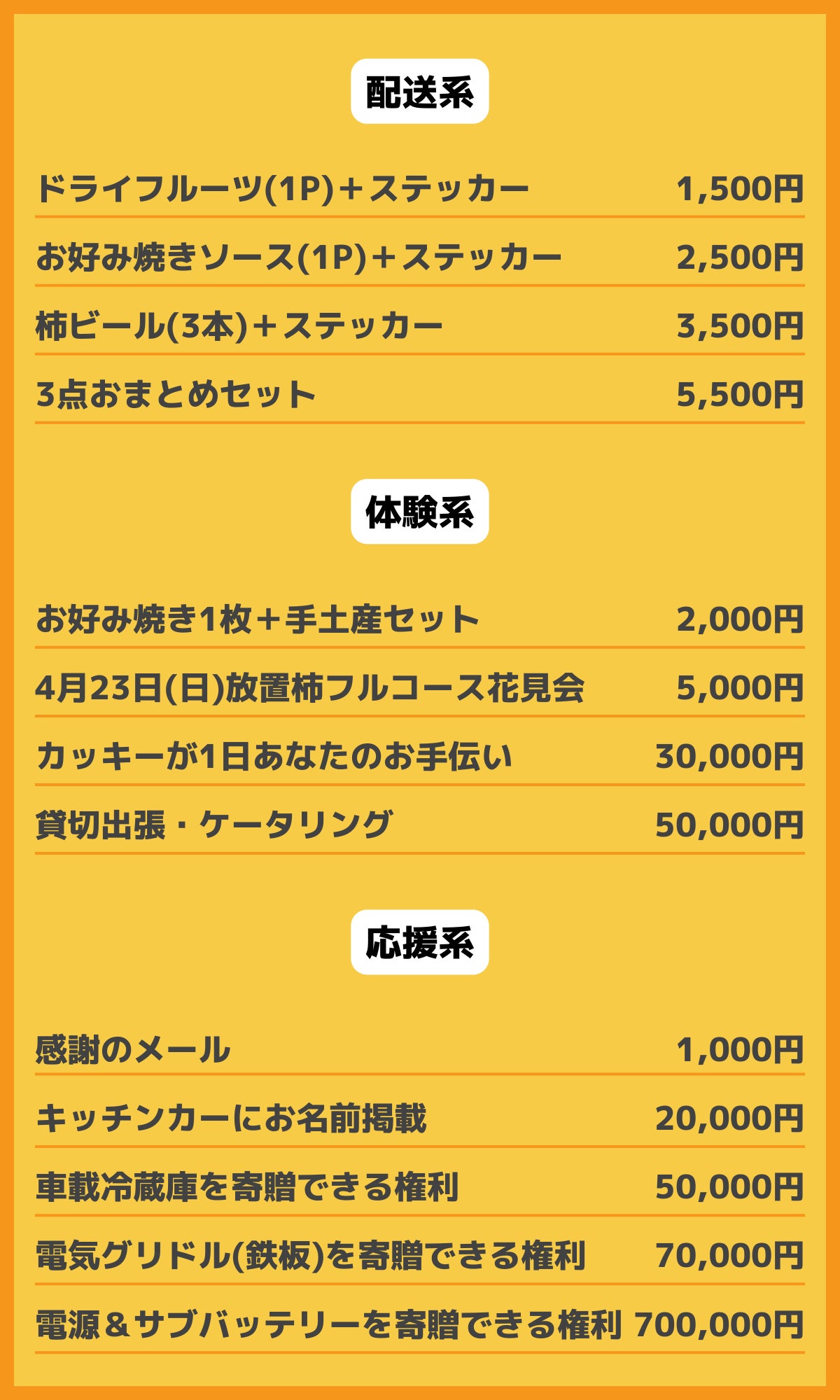 リターンには放置柿の加工品(ドライフルーツ、お好み焼きソース、柿のお酒)の他に、お好み焼き1枚+手土産セットや、貸切出張・ケータリング、などをご用意致しました!ぜひご覧ください!
