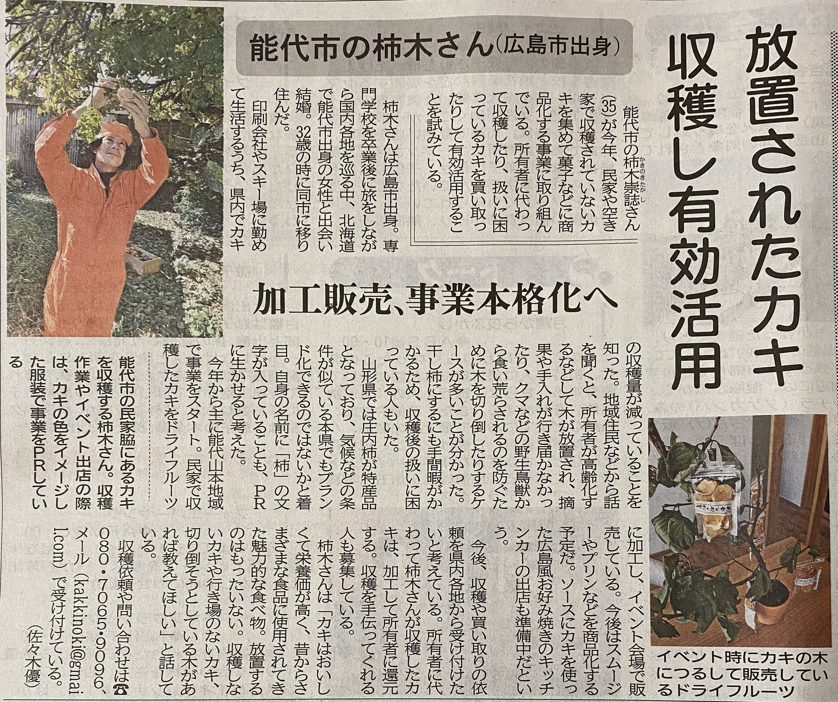ご覧いただきありがとうございます。秋田県の北部で『畑がない農家』というコンセプトで放置された柿を収穫し加工・販売している「柿のお兄さん」ことカッキーです。