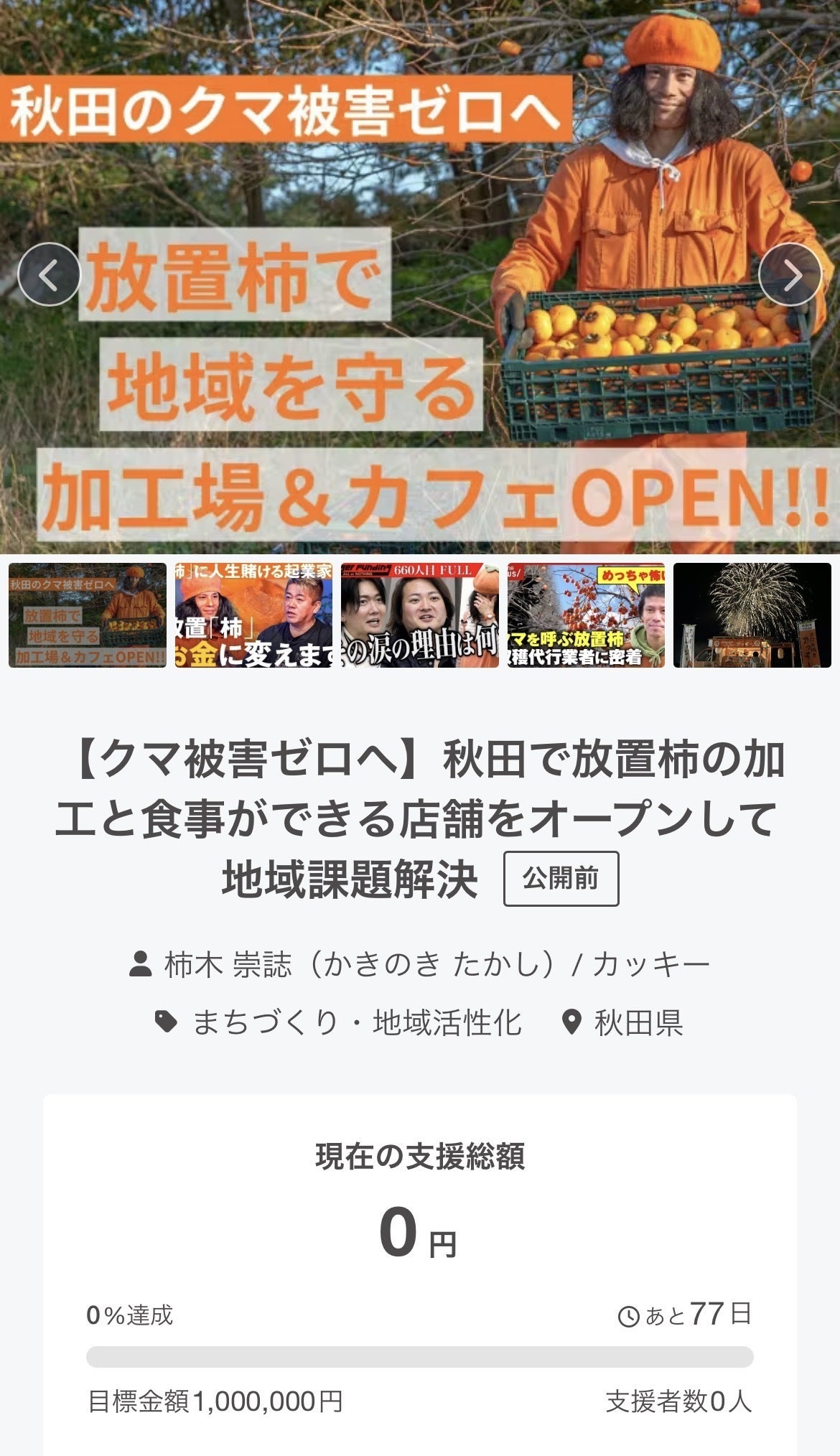 2026/03/15 21:53いつも温かいご支援をいただき、心より感謝申し上げます。 カッキーです。改めまして、第一弾・第二弾プロジェクトにご協力くださった皆様、本当にありがとうございました!!さて、このたび皆様のご支援で実現したクマ対策活動をさらに拡大するため、第三弾クラウドファンディングを本日より開始いたしました!加工場と店舗を設けることで、柿の処理能力を高め、クマ対策の取り組みを加速させることを目指しています。【 第三弾プロジェクトページはコチラ】今回も皆様からご支援をいただけますと、これ以上の励みにはなりません。何卒よろしくお願い申し上げます。柿木 もっと見る