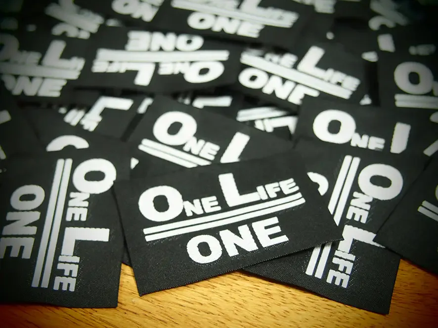 バックパックのメインコンパートメント内部、PCスロットに縫い付けされた「ONE LIFE ONE」のロゴ織りネーム。実は、、、この織りネーム自体も日本製にこだわりました!今回のパックバックを作成するのにあたり、福井県で家内制工業を営む織りネーム製造メーカーさんと打合せを行い、作成した日本製織りネームです。(福井県は日本でも有数の合成繊維の素材産地であり、リボンテープ等の製造メーカーも多く操業しております。)ロゴを表現する細かな曲線も見事に再現していただきました!さすがのジャパンクオリティです。