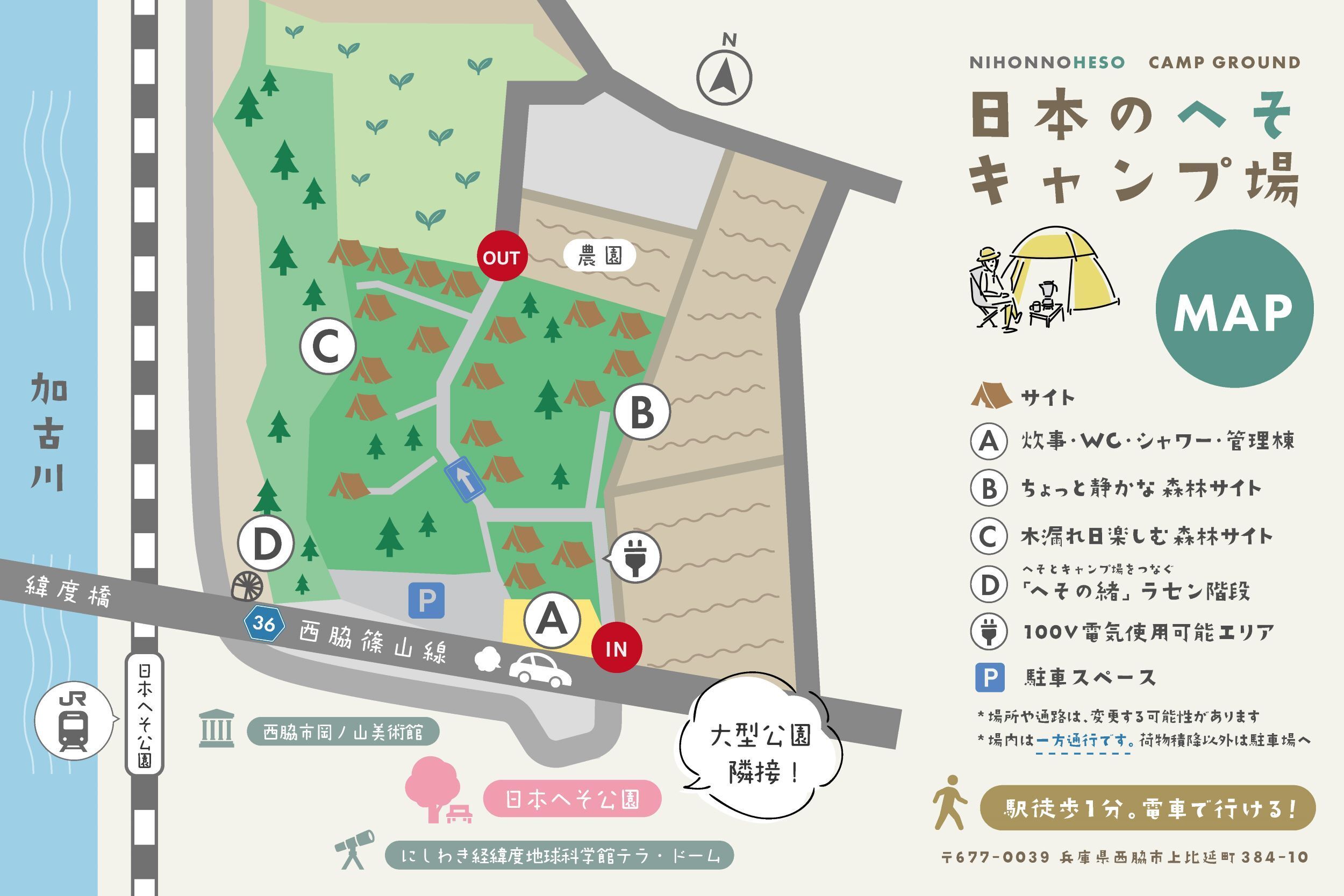 すぐ近くには「JR日本へそ公園駅」があり、今回のキャンプ場はその2箇所に隣接した場所にあります。