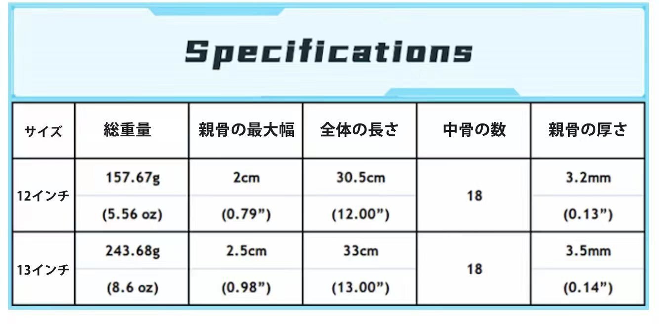 13インチ版は、旧型に比べて中骨が3本増えただけで、旧型より40g重くなっています。 このようにして、各骨に広がる力が小さくなるため、ファニングが壊れたり裂けたりする可能性が低くなります。