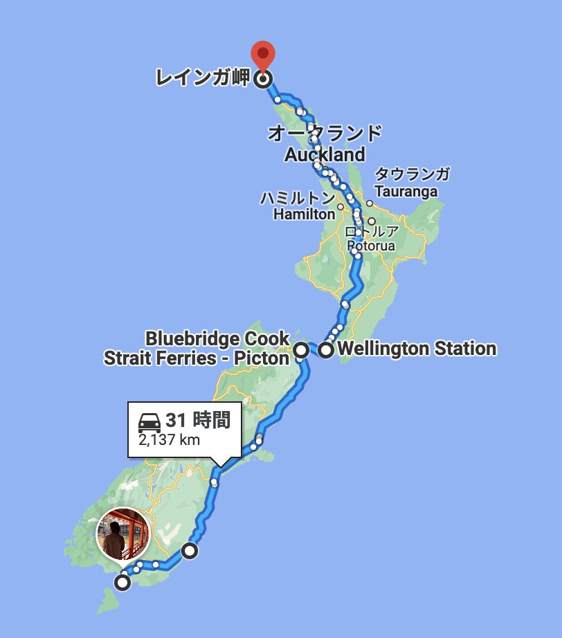 スタート地点は南島最南端の街「ブラフ」、ゴールは北島最北端「レインガ岬」