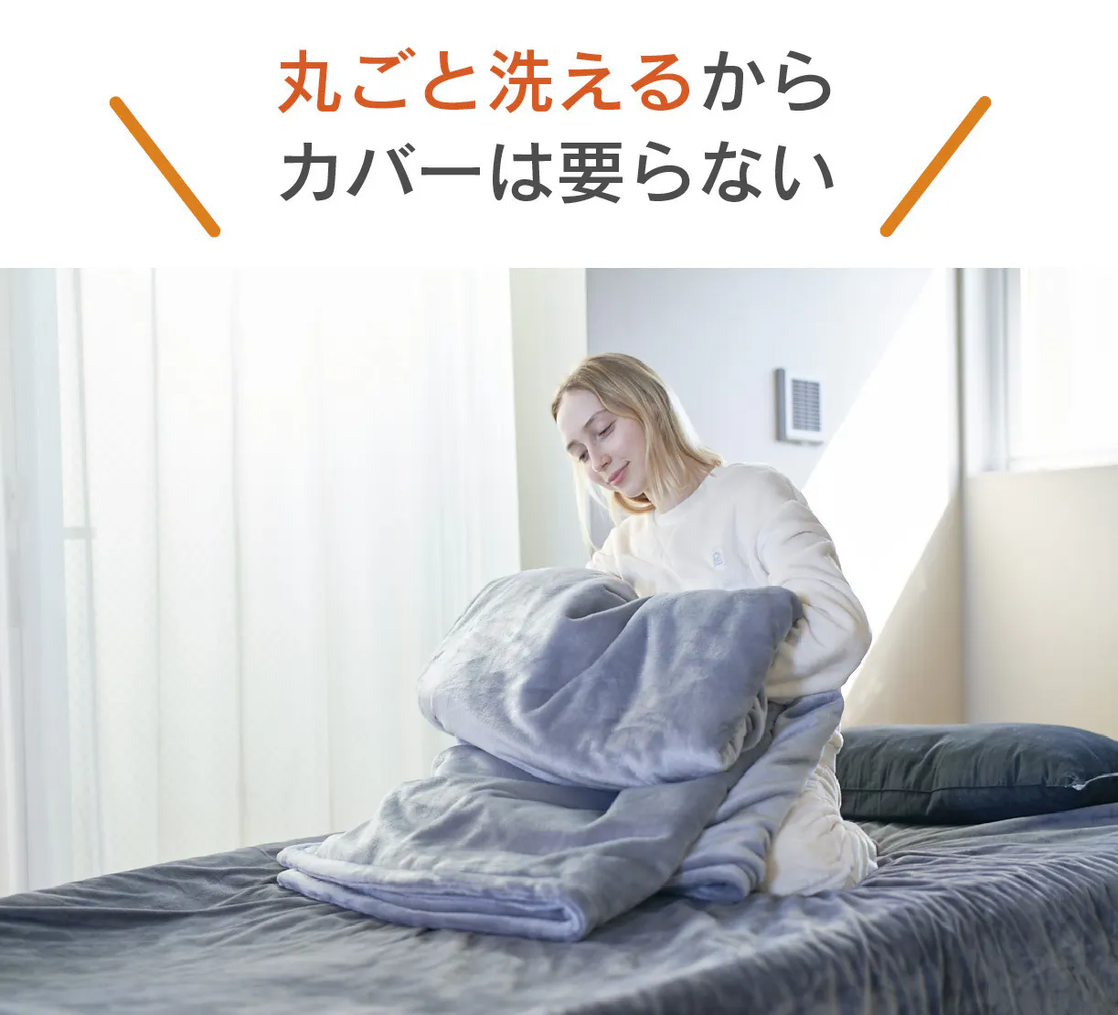 A:洗濯の際は、布団用の大きな洗濯ネットに入れていただくことをおすすめしています。なお、漂白剤・乾燥機・アイロンはお控えください。