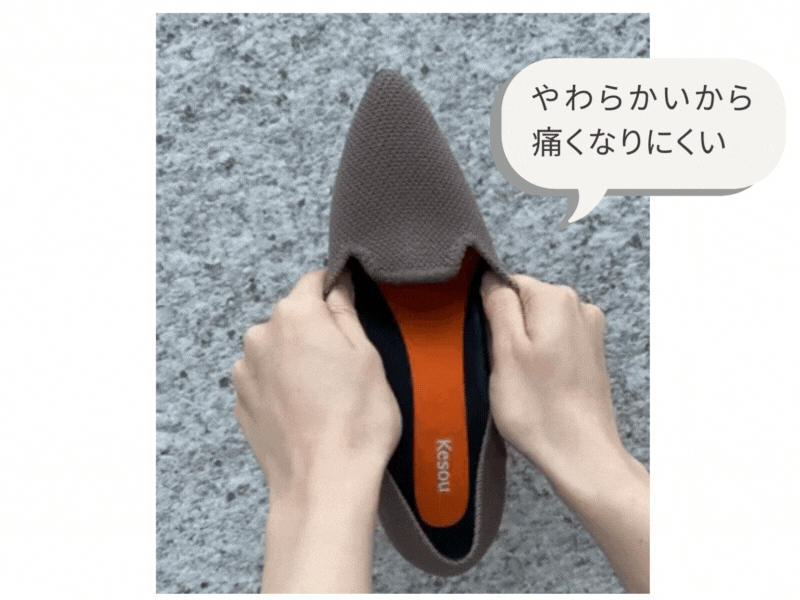 Kesouパンプスは、生地のやわらかさと足にやさしくなじむフィット感が特徴。