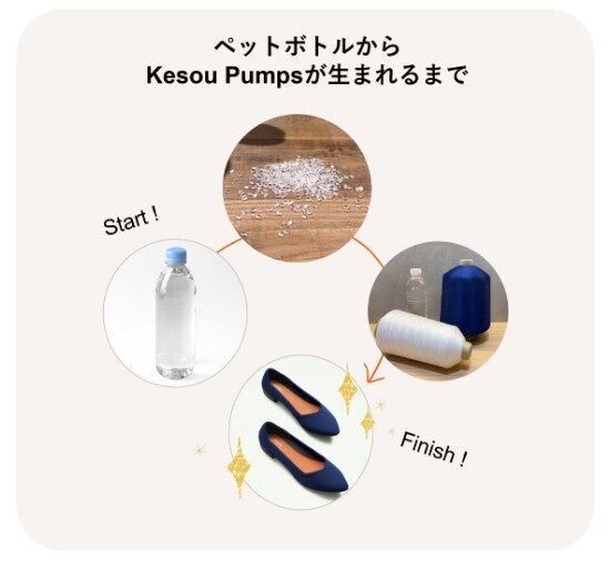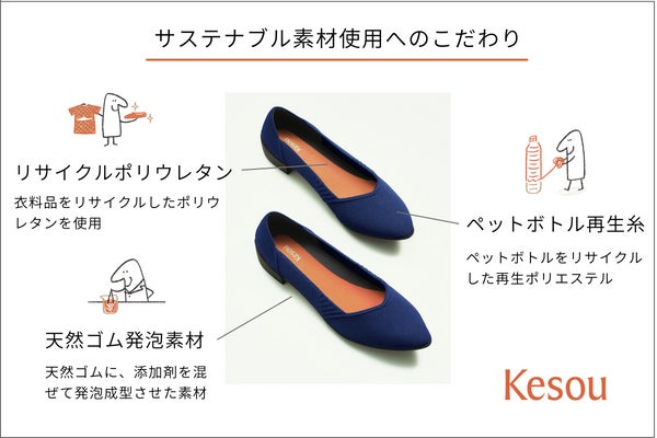 Kesouのパンプスはどのデザインも、メイン素材にペットボトル再生糸をはじめとしたリサイクル素材・天然素材を使用しています。
