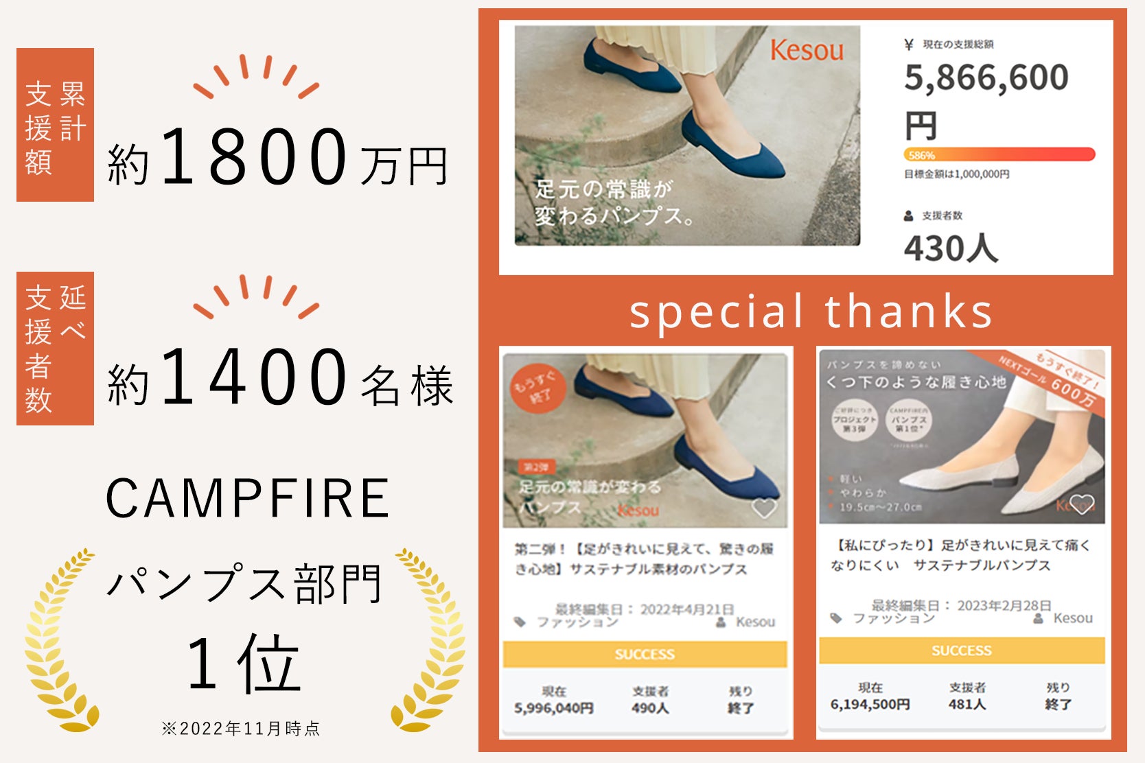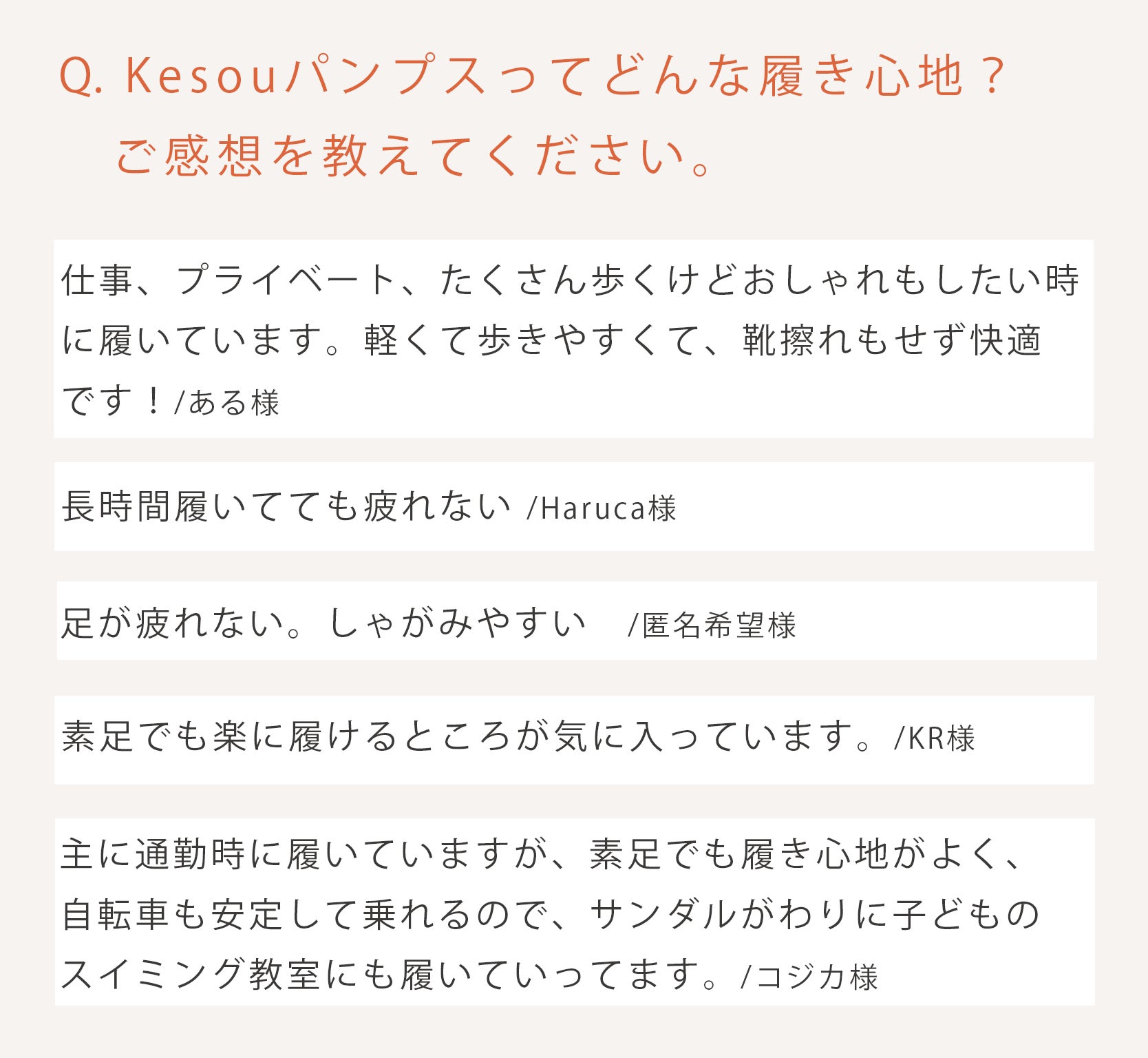 今回のクラウドファンディング実施にあたっても、Kesouパンプスの履き心地についてアンケートを実施したところ、あたたかいお言葉をたくさんいただきました。
