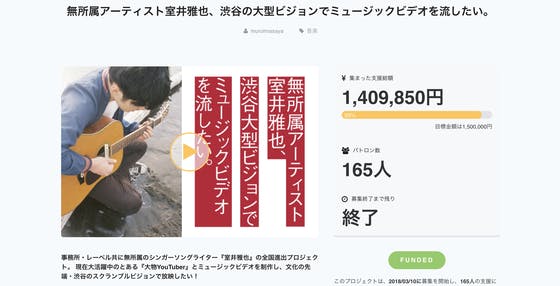 2018/04/30 06:43こんにちは。室井雅也スタッフです。 昨日4/29をもって、「無所属アーティスト室井雅也、渋谷の大型ビジョンでミュージックビデオを流したい。」クラウドファンディングプロジェクトが終了いたしました。 まずは、結果をご報告いたします。 プロジェクト結果============ 総支援金額:1,409,850円 総パトロン数:165人 ==================== 皆様のおかげで、140万円超の支援金額を集めることができました。 高い目標を設定した我々自身も正直、この金額まで集まるとは、思っていませんでした。 しかし、最終日を前にした急速な追い上げ。 100万円を超えてからも着々と増え続けていく支援金額に、本人・スタッフ共に身震いするような感覚を覚えました。 「もしかしたら、本当に達成できるのではないか?」 そんな希望も、夢ではないくらいに思えました。 しかしながら、結果は目標150万円目前でのプロジェクト終了。 支援をしてくださり、期待をしてくださった皆様への申し訳ない気持ち、そして我々自身の悔しさは尽きることがありません。 しかし、多くの方々に支えていただいたこと、応援していただいたこと、何より集まった支援金額は、一切消えることはありません。 皆様にいただいた期待を背負い、これからも精力的な活動を、進めてまいります。 ◉今後について 今回、目標金額を達成することはできませんでしたが、第一目標でありました『ヒロインは君で ミュージックビデオ制作』は、50万円を達成したため、実行することが決定しました! 現在すでに監督となる大物YouTuberの方との制作は進んでおり、このタッグだからこそできる、壮大なスケールのミュージックビデオを制作し始めております。 公開時期などについては、また改めてこのページ、そして各種公式SNSなどで発表いたしますので、お待ちください! 『スペシャル動画』のリターンをお選びいただいた方は、ミュージックビデオのメイキング映像なども収録の予定ですので、ご期待ください! そして、集まりました支援金額についてですが、 今回集まりました140万円は、ミュージックビデオの制作費のほか、 今回ご支援いただきました皆様への各種リターンの準備費、 そして『全国進出』を目標に掲げた室井雅也の、様々な活動費用として、最大限活用させていただきます。 =============================140万円まで行ったのなら、頑張れば放映できそうじゃん!そう思う方もいらっしゃるかと思います。 しかしながら今回は、150万円を達成することでようやくビジョンへの放映ができる、ギリギリのラインでの目標金額設定でしたので、 我々自身も歯がゆい思いでいっぱいですが、残念ながら放映は叶いませんでした。============================= 惜しくも今回、『スクランブル交差点でのMV放映』というプロモーションを行うことはできませんでしたが、 それに負けないぐらい、多くの皆さんに室井雅也を知っていただける様々な施策を行ってまいりますので、 何卒ご期待頂けますと幸いです。 ◉最後のごあいさつ 重ね重ねにはなりますが、この度室井雅也のクラウドファンディングプロジェクトにおきまして、 ご支援をいただきました皆様、各種SNS等での告知・応援にご協力いただきました皆様、 本当にありがとうございました。 今後とも変わらぬ室井雅也への応援・ご協力をいただけますと、幸いでございます。 本当に、本当に、ありがとうございました!!! 室井雅也マネージャー 安藤勇作 もっと見る