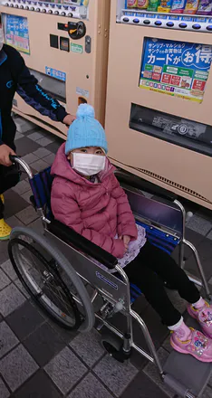 小さな体を、大きな大人用の車椅子に乗せ、お出かけ…