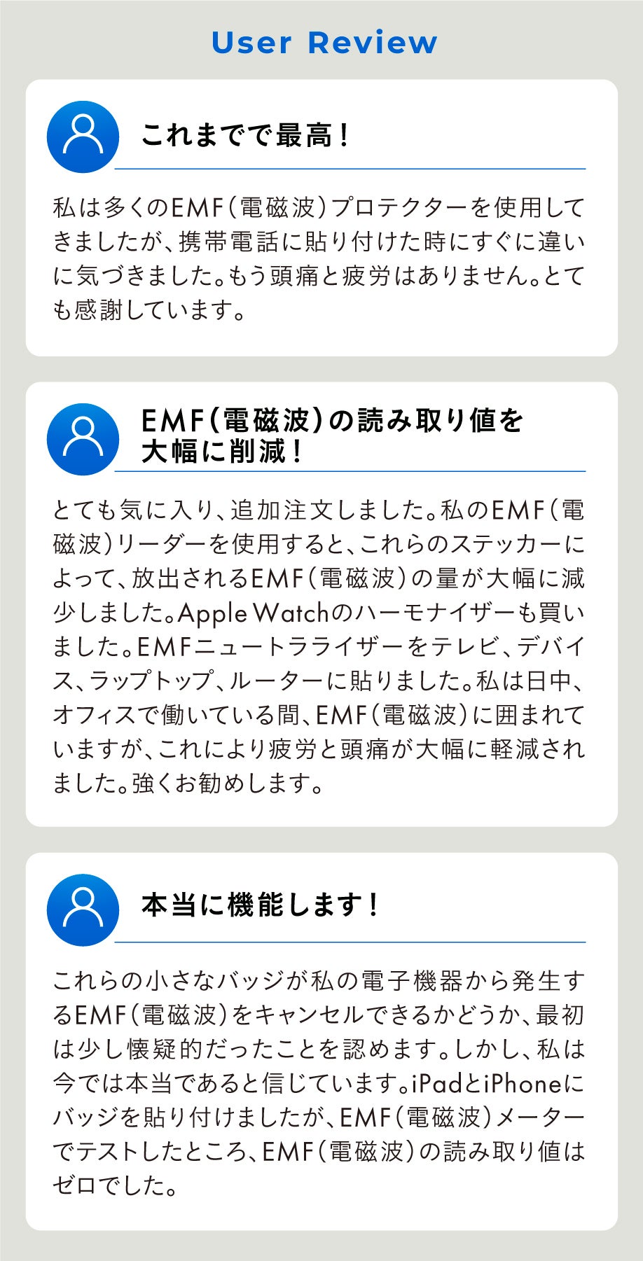 従来ある電磁波カットシールとは全く違い、電磁波をカットするのではなく電磁波に対して逆周波である30以上のホメオパシー周波数を放つことによりあなたを電磁波から守ります。
