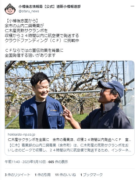 ご支援者様の皆様この度、北海道新聞(小樽後志エリアの地域版)に本プロジェクトが掲載されました。Web版はこちらです。「仁木産サクランボを全国に 余市の青果店、収穫24時間以内発送へCF 宣伝効果も期待」 クラウドファンディングへの挑戦は不安だらけでのスタートでしたが、まさか新聞社からの取材がくるほどのインパクトがあるプロジェクトになるとは、全く想像しておりませんでした。当社の取り組みにご賛同いただき、ご支援者の皆様には本当に感謝してもしきれません。プロジェクトの終了日が近づいてきておりますが、引き続き、「北海道仁木町のさくらんぼを美味しさのピークで届けたい!」の応援をSNSでの拡散などでよろしくお願いいたします!!