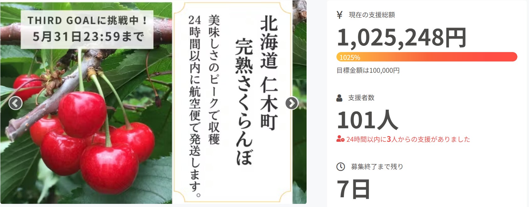 日頃より当プロジェクトをご支援いただき誠にありがとうございます。募集期間が残り1週間のタイミングを迎え、現在101名の方から100万円超ものご支援をいただいておりますこと、改めて御礼申し上げます。クラウドファンディングという手法を通じて、ご支援者様によるSNS拡散をはじめとした多大なるお力添えがありました。その結果、全国の皆さまに仁木町のさくらんぼを知っていただくきっかけとなっている確かな実感があります(募集期間を通じて8,000件以上のPVがあるようです…!)皆さまからのご期待に応えるべく、さくらんぼのお届けまで引き続きの情報発信と、お届けするさくらんぼの品質には十二分にこだわってまいります!引き続き、「北海道仁木町のさくらんぼを美味しさのピークで届けたい!」の応援・SNS拡散など、最後までどうぞ宜しくお願いいたします。
