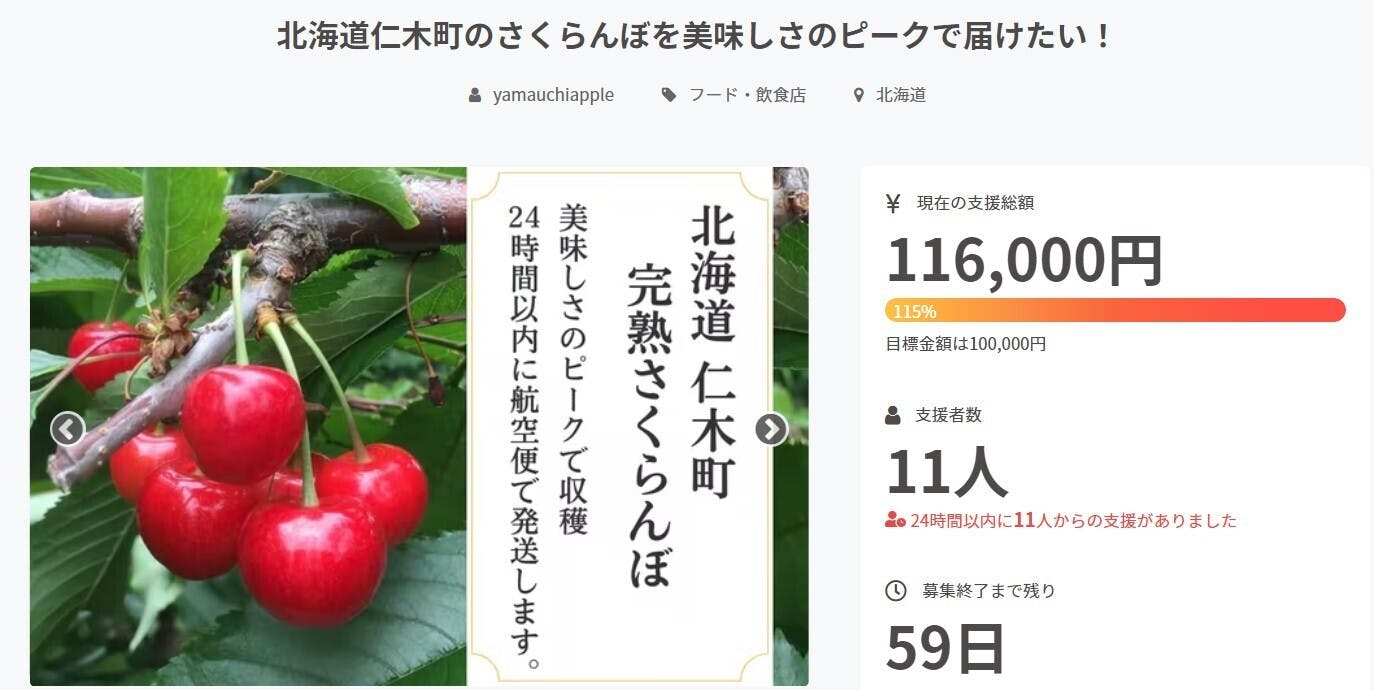 引き続き、「北海道仁木町のさくらんぼを美味しさのピークで届けたい!」の応援をSNSでの拡散などでよろしくお願い致します...!!