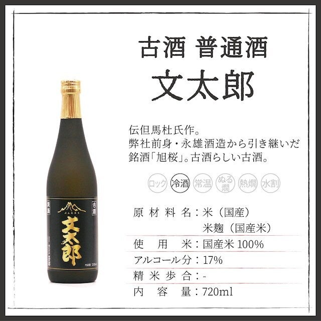 文太郎の前身酒蔵「永雄酒造」において但馬杜氏の技で造られたと言われる古酒のひとつ。12年熟成された古酒らしい古酒です。
