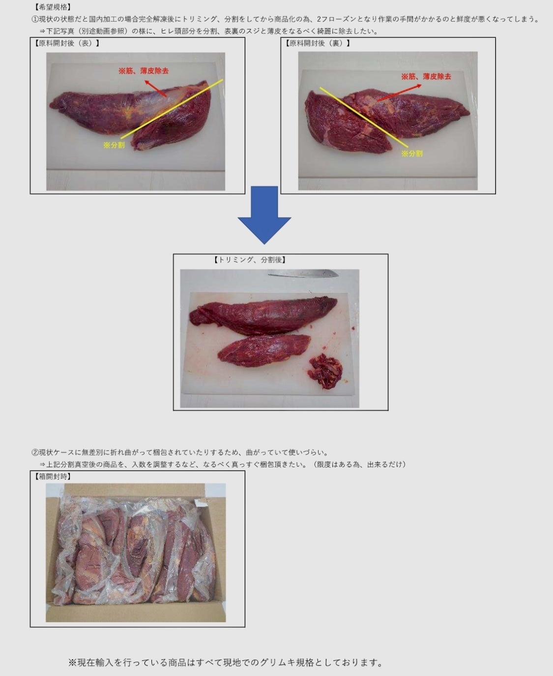 1.冷凍:馬ヒレ(テンダーロイン)サイズ1本あたり約1.5㎏〜2.2㎏ x 1本 ¥10,900(税込み/送料込み)