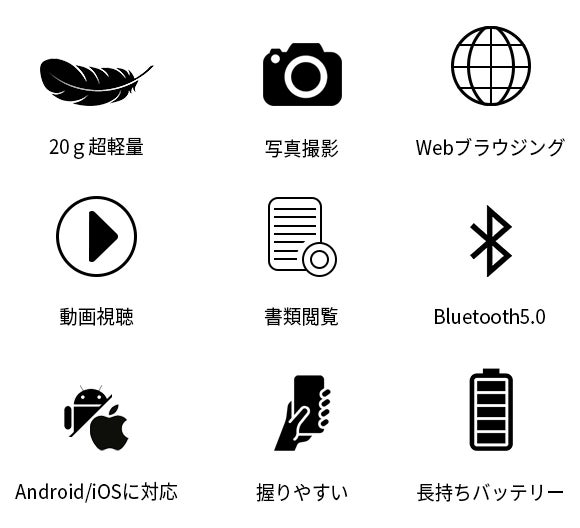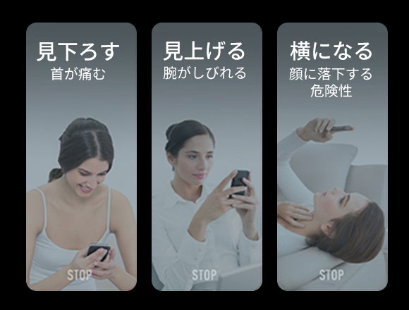 本体重量たった20g、親指一本で操作でき、人間工学に基づいたデザイン、快適なグリップ……シチュエーションを選ばす活躍します。下を向いてスマホを操作することによる首の痛みなどの問題も解決します。