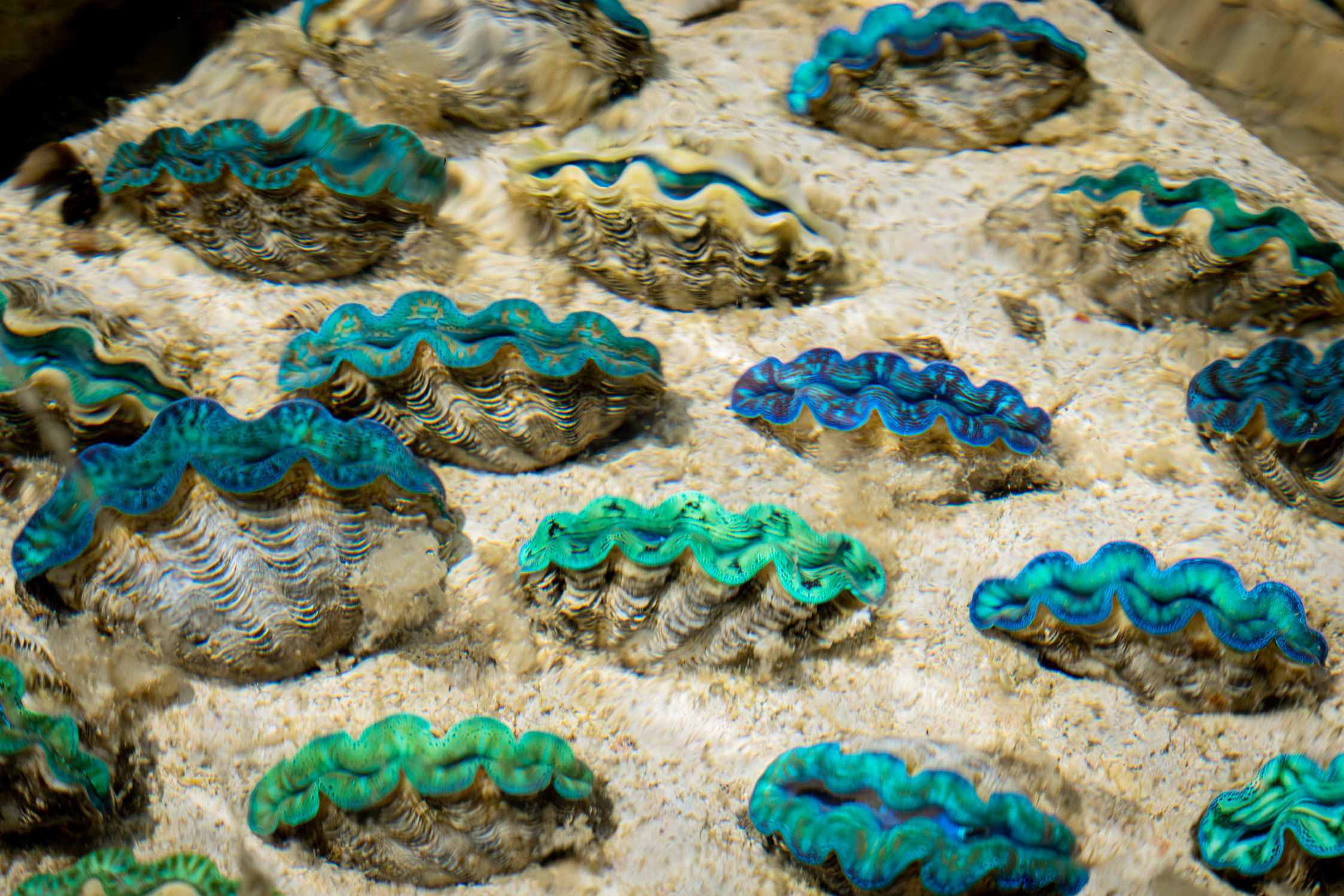 観賞用としては、大きく波打った形が特徴のシャコ貝ですが、ヒメシャコ貝は口を開いた中の鮮やかなブルーが特徴です。
