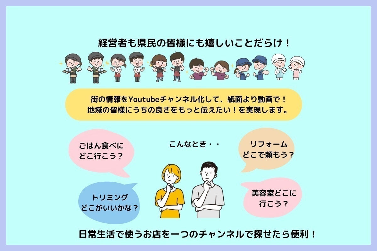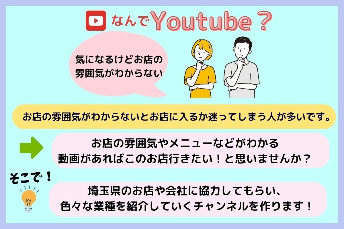 埼玉県の色々な業種の方にご協力頂き、お店や会社を紹介するyoutubeチャンネルを運営したいです。