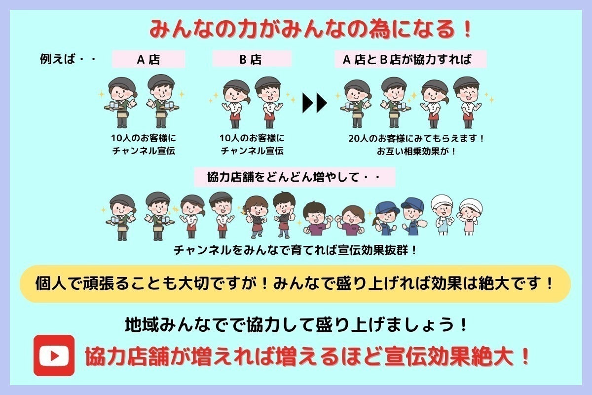 埼玉県全体のチャンネルにすることで協賛店舗が増えれば増える程、より宣伝効果が高まる仕組みです。