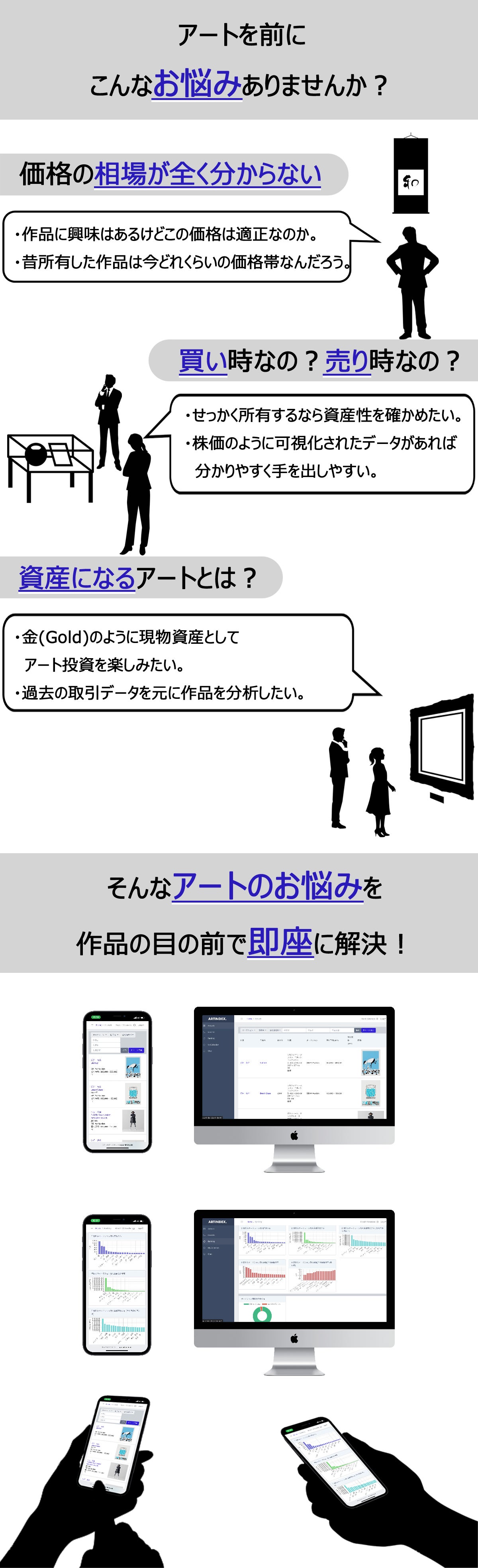 “目の前にある作品の情報を入力 → 作品の流通相場を知る → 作品を購入または売却の架け橋とする”