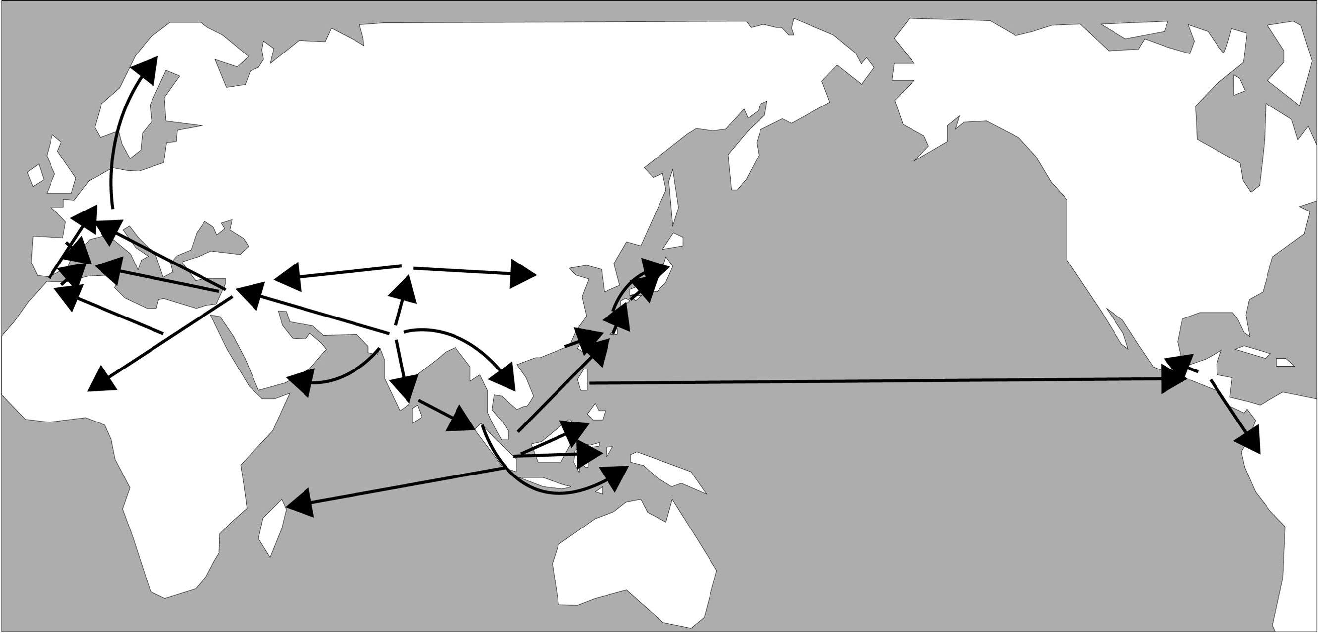 岡村吉右衛門の構成による絣の伝播主要ルート想定図(出典:江口久美. 文化伝播の経糸と緯糸─ 絣(かすり)織り文化の世界史における伝播経路. 稲賀繁美編「映しと移ろい 文化伝播の器と蝕変の実相」. 花鳥社, 2019, 120p.)