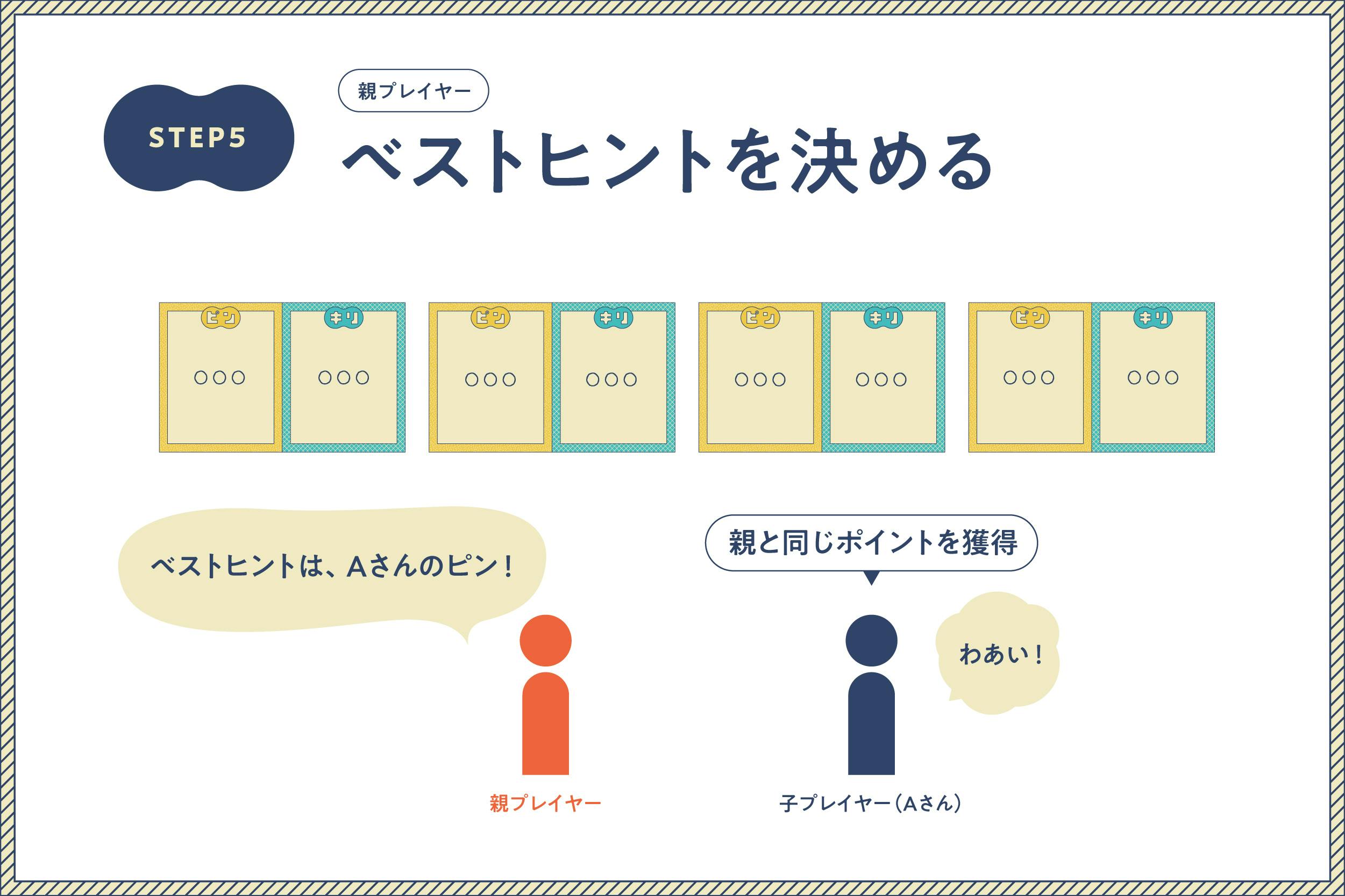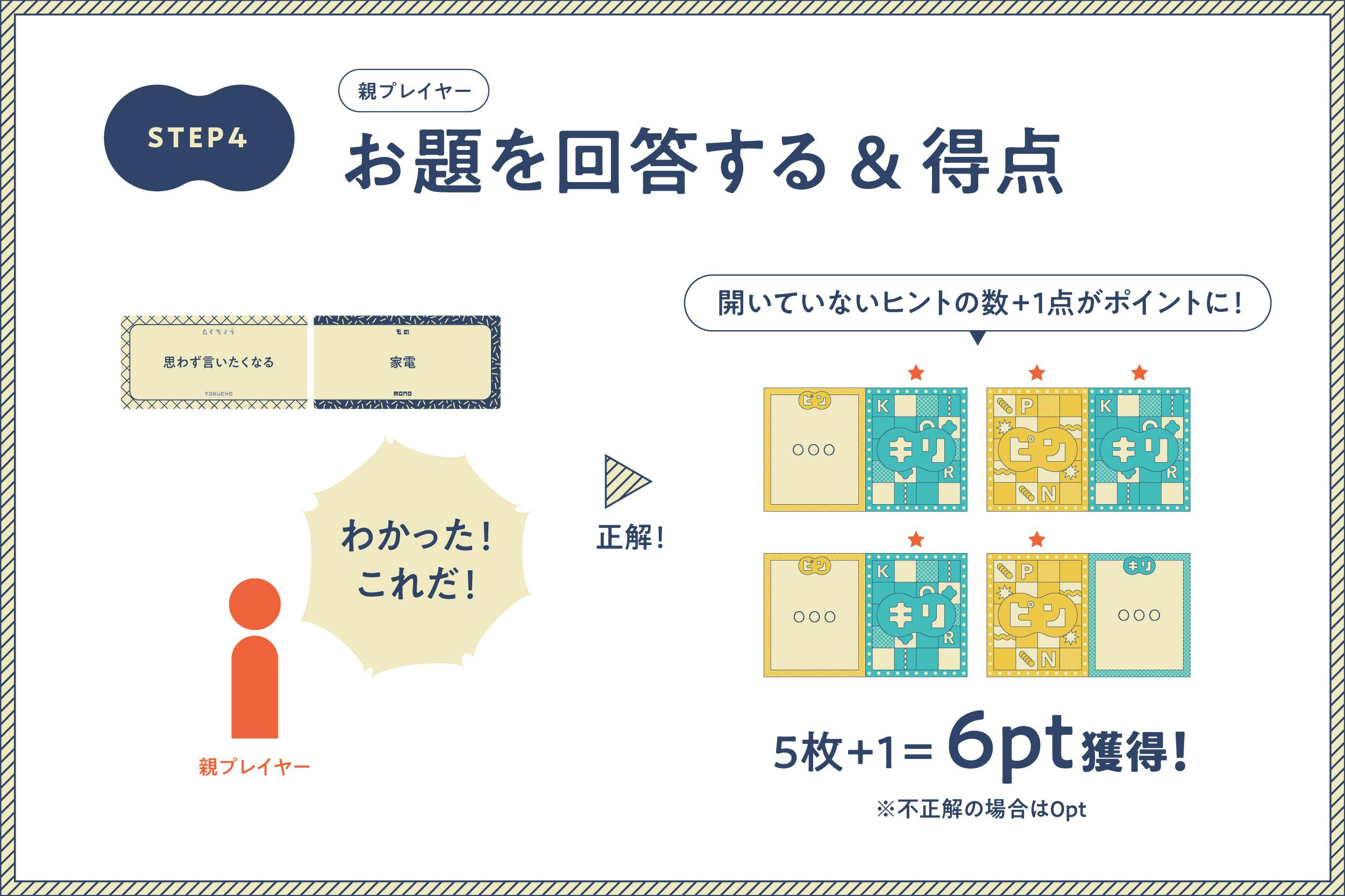 Ⅴ.正解した場合、親プレイヤーは一番決め手になったピンorキリを、“ベストヒント”に認定します。ベストヒントに選ばれたプレイヤーは、親と同じ点数を獲得!