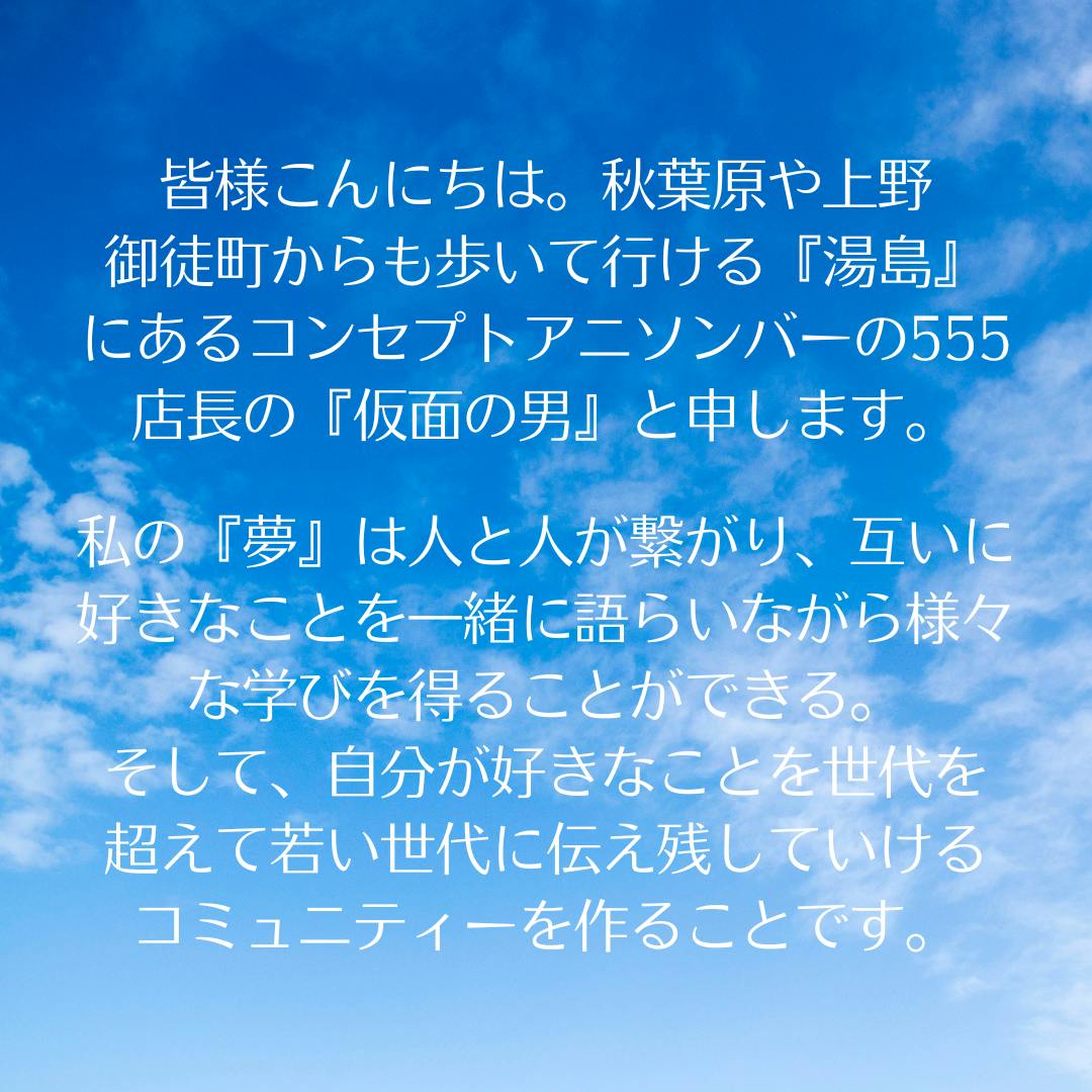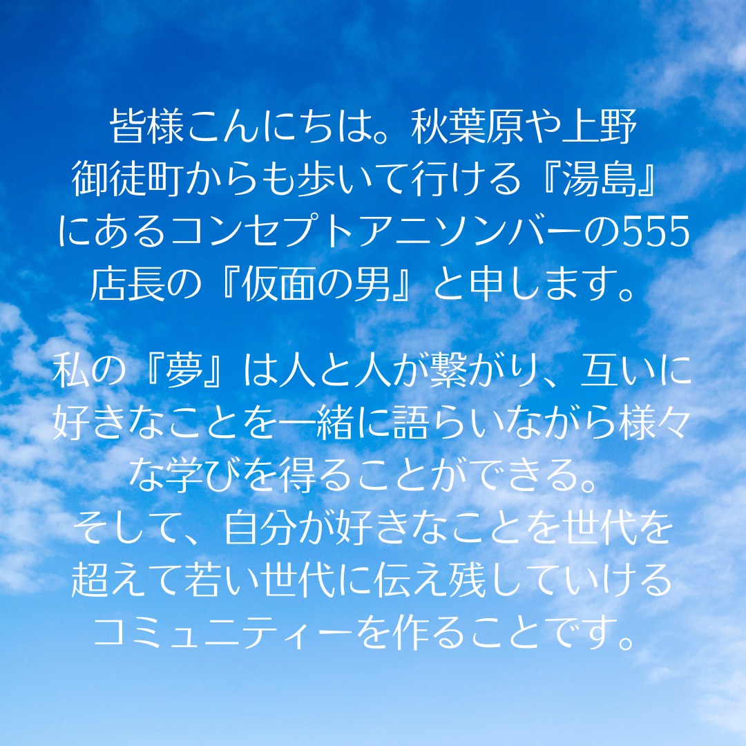 そんな中、とある『きっかけ』により日本で最も人が集まる『東京』で自分のお店を開けるチャンスが見つかり、私は次の人生を賭けてみる価値があると思いコンセプトアニソンバー555のオープンに踏み切りました。