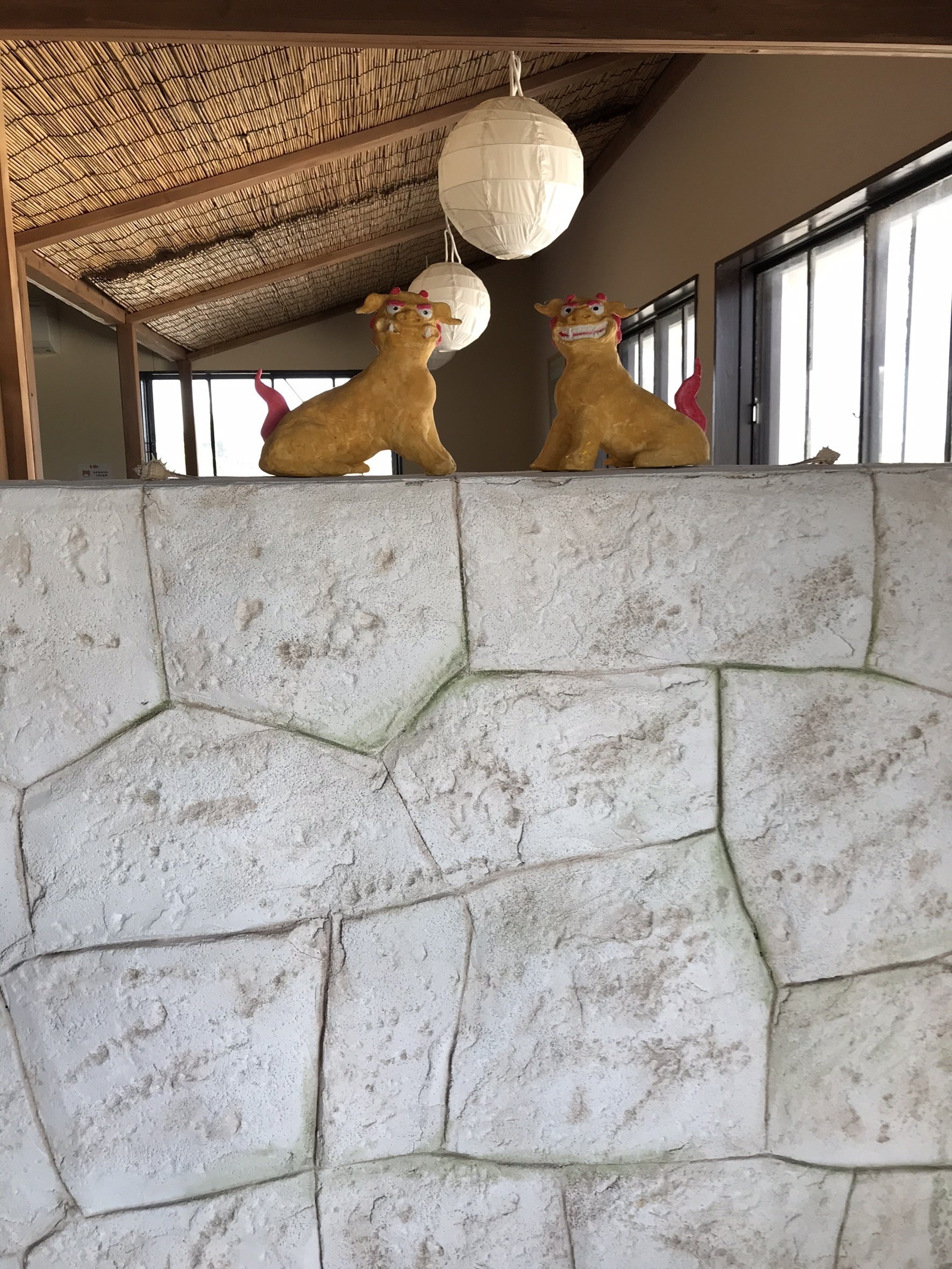 ヒンプンの上でお客様をお出迎えしている黄色いシーサーは長女の手作りで実は紙粘土で出来ています。