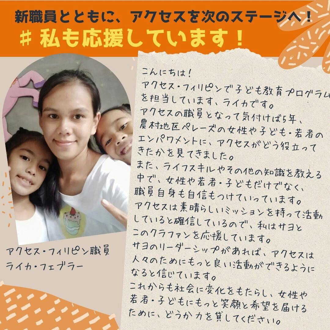 今日は農漁村ペレーズで長年、子ども教育担当スタッフとして働いているライカからの応援メッセージをお届けします。