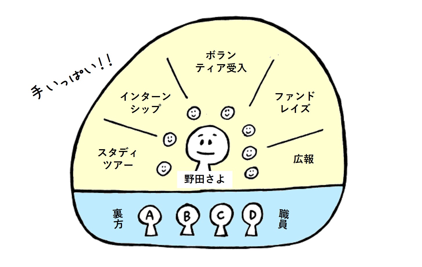 4人の信頼できる職員(3人はパートタイム)が非常に丁寧・堅実に裏方の仕事を支えてくれている一方で、外向きの活動の多くが、私・野田に集中しています。業務の一部をほかの職員に引き継いではきたものの、職員の持つスキルとマッチしないこともあり、まだ対外的な業務の大半を私が担っているのです。