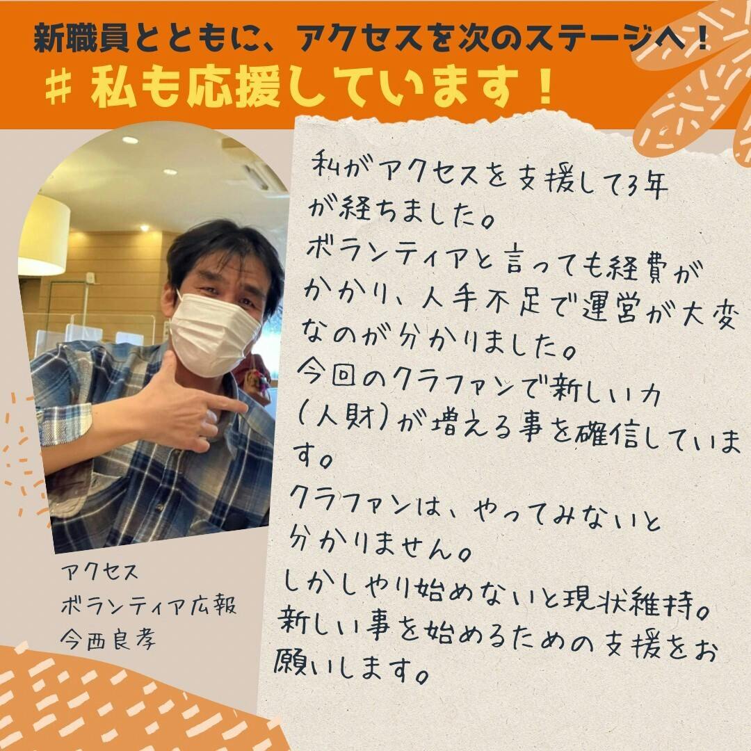 私がアクセスを支援して3年が経ちました。ボランティアと言っても経費がかかり、人手不足で運営が大変なのが分かりました。今回のクラファンで新しい力(人財)が増える事を確信しています。クラファンは、やってみないと分かりません。しかしやり始めないと現状維持。新しい事を始めるための支援をお願いします。