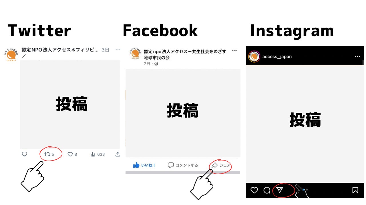 開催当日にアクセスのアカウントからの投稿をリツイート(twitter)、シェア(Facebook、Instagram)していただくだけです。