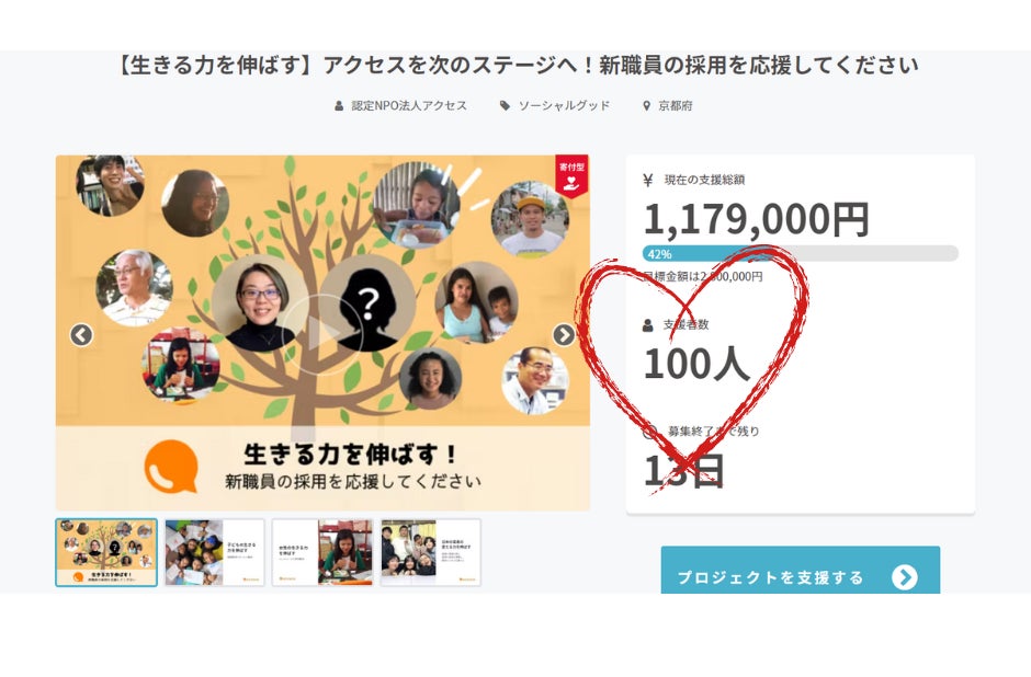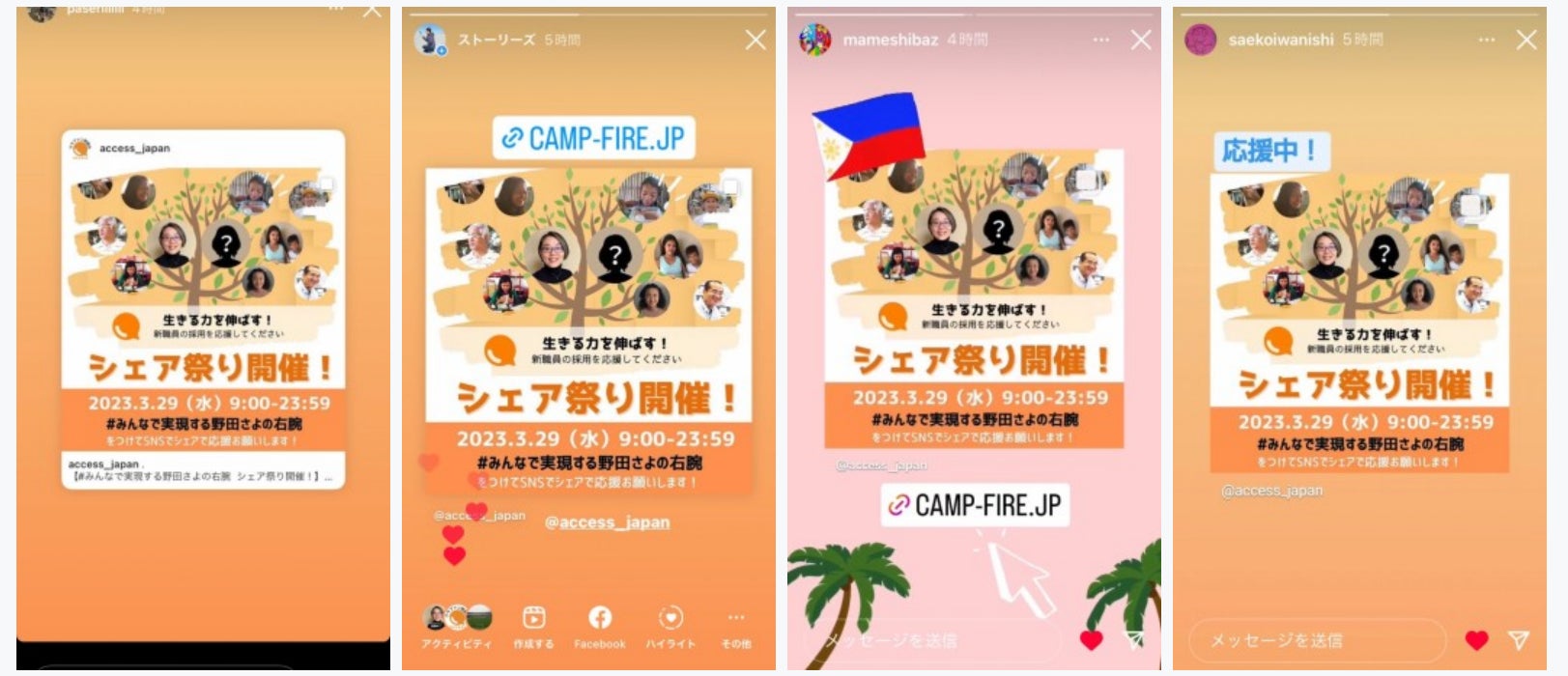 「私の推しNPOです」「寄付しました!」といった応援コメントを短くてもいいのでつけてもらうと、とっても注目してもらいやすくなります。あなたのフォロワーの皆さんは、アクセスの投稿よりも「あなたの言葉」に目がいくからです。